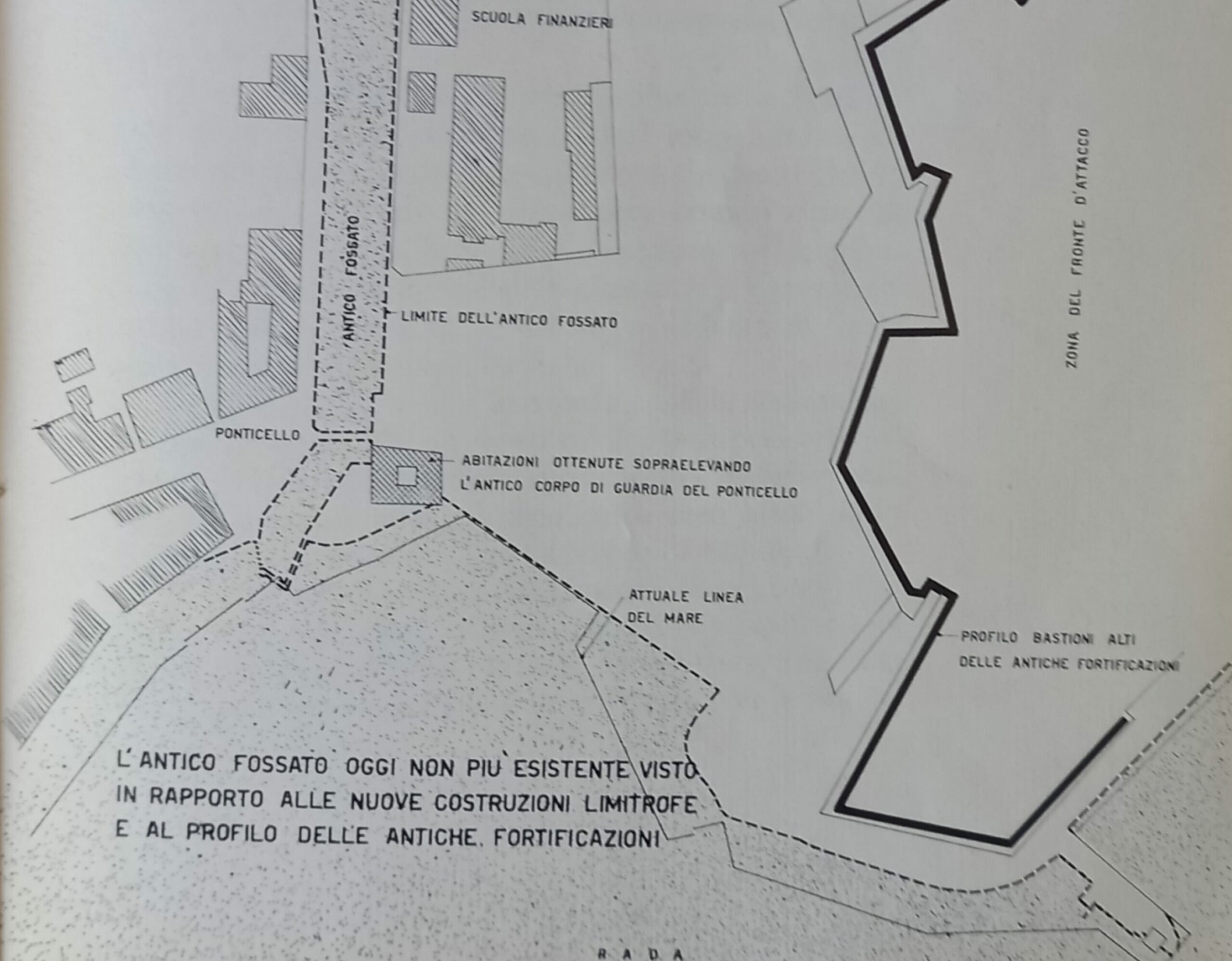E’ situato al piede del promontorio oltre le opere esterne, alla distanza di 160 circa dalla cinta. Comincia col mare alle due estremità,a Nord presso la spiaggia delle Ghiaie,a Sud presso l’interno della rada.