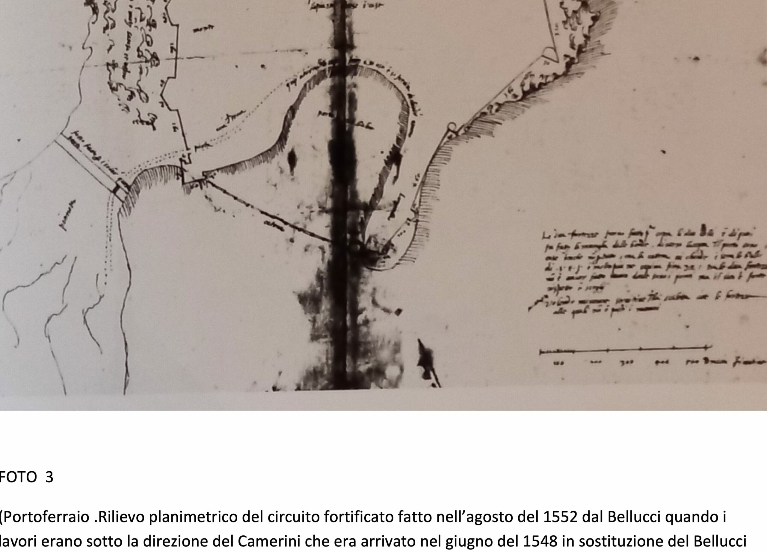 Bellucci ritorna all’Elba nel 1552 per un rilievo planimetrico delle opere del circuito fortificato condotte sotto la direzione del Camerini perché deve compilare per il duca Cosimo un atlante delle più importanti città fortificate d’Europa.Nel rilievo planimetrico , con parti tratteggiate,aggiunge qualche proposta che commenta con didascalia “fatto fosso per isolar questa terra”.