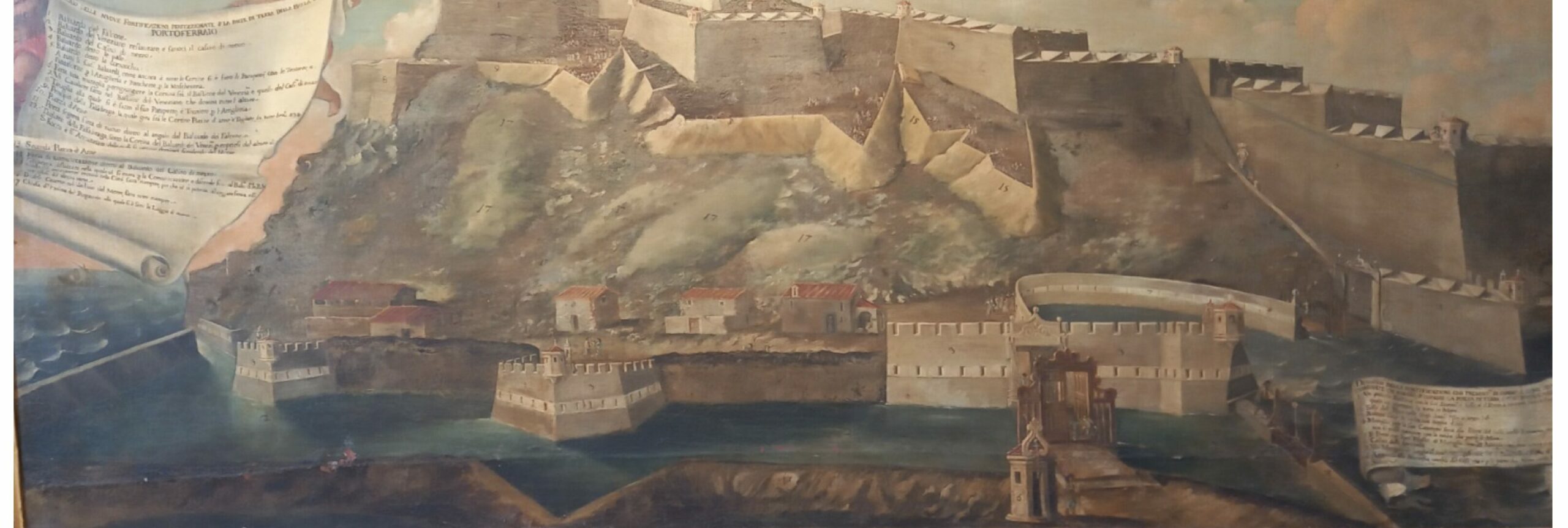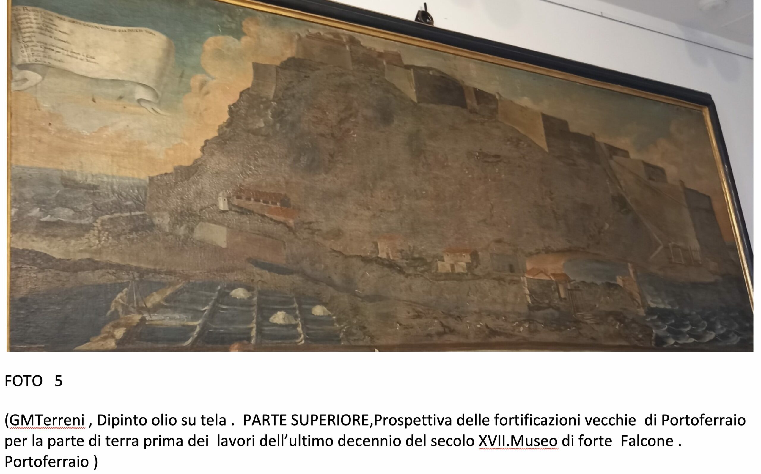 (GMTerreni , Dipinto olio su tela . PARTE INFERIORE ,Prospettiva delle fortificazioni vecchie di Portoferraio per la parte di terra dopo i lavori dell’ultimo decennio del secolo XVII.Museo di forte Falcone . Portoferraio )
