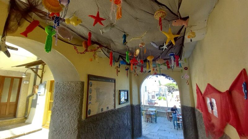 Sotto l’iconica Porta a San Piero in Campo, il gruppo “Tramandando” ha realizzato un’installazione artistica che invita a riflettere sui cambiamenti climatici e sulle loro conseguenze. L’opera, intitolata “E SE IL MARE SALISSE A S.PIERO?”, consiste in una serie di immagini che creano l’illusione di un ambiente marino popolato da creature cucite e ricamate a mano.