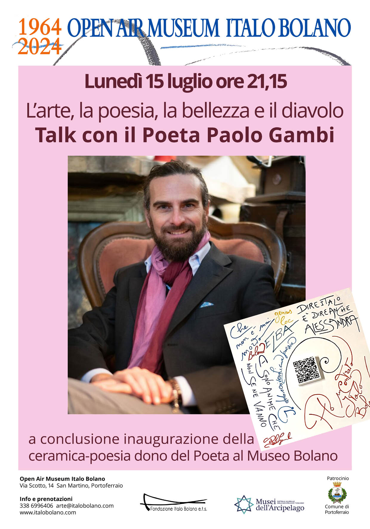 Verrà quindi inaugurata la ceramica – poesia, dono del Poeta al Museo Bolano, opera che andrà ad aggiungersi alle molte già realizzate e installate per Istituzioni e Musei in Italia e all’estero.