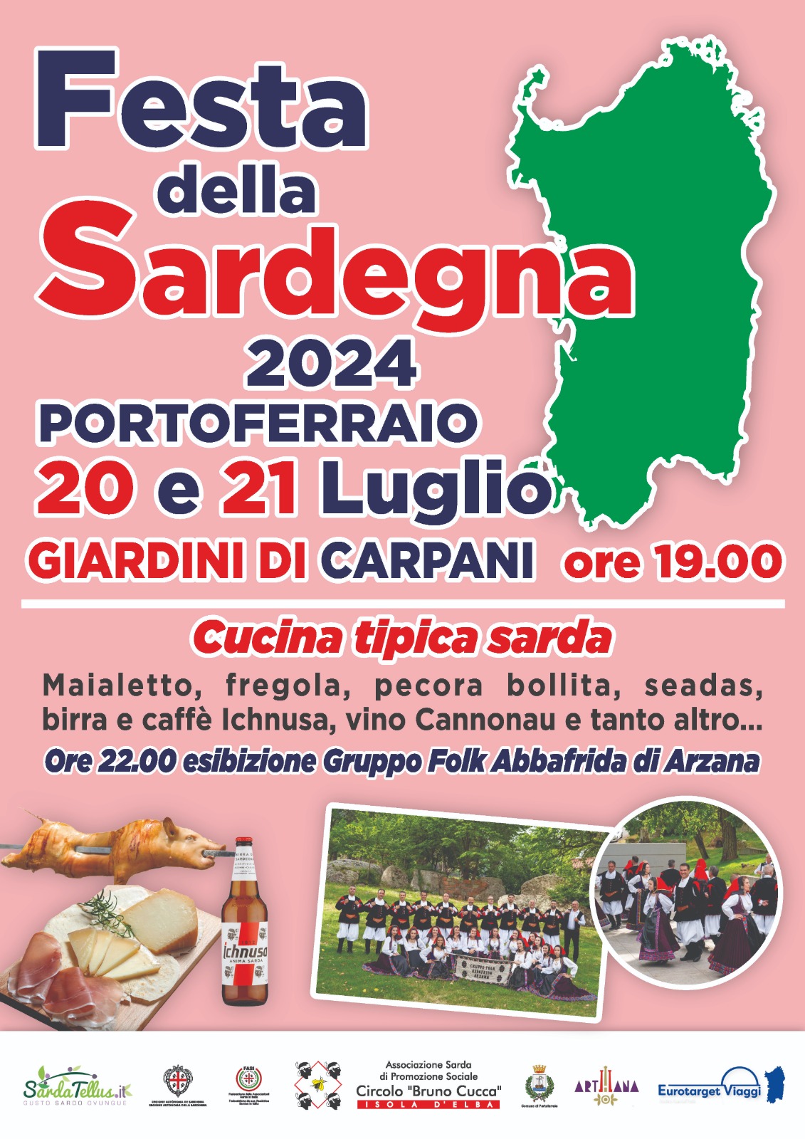 Festa della Sardegna ai giardini di Carpani a Portoferraio nei giorni 20 e 21 luglio a cominciare dalle ore 19.00. Durante la festa si gusterà la cucina tipica a base di mailetto, fregola, pecora bollita, seadas, birra Ichnusa e caffè, vino Cannonau e tanto altro. Alle 22.00 è inoltre prevista l’esibizione del gruppo folk Abbafrida di Arzana.