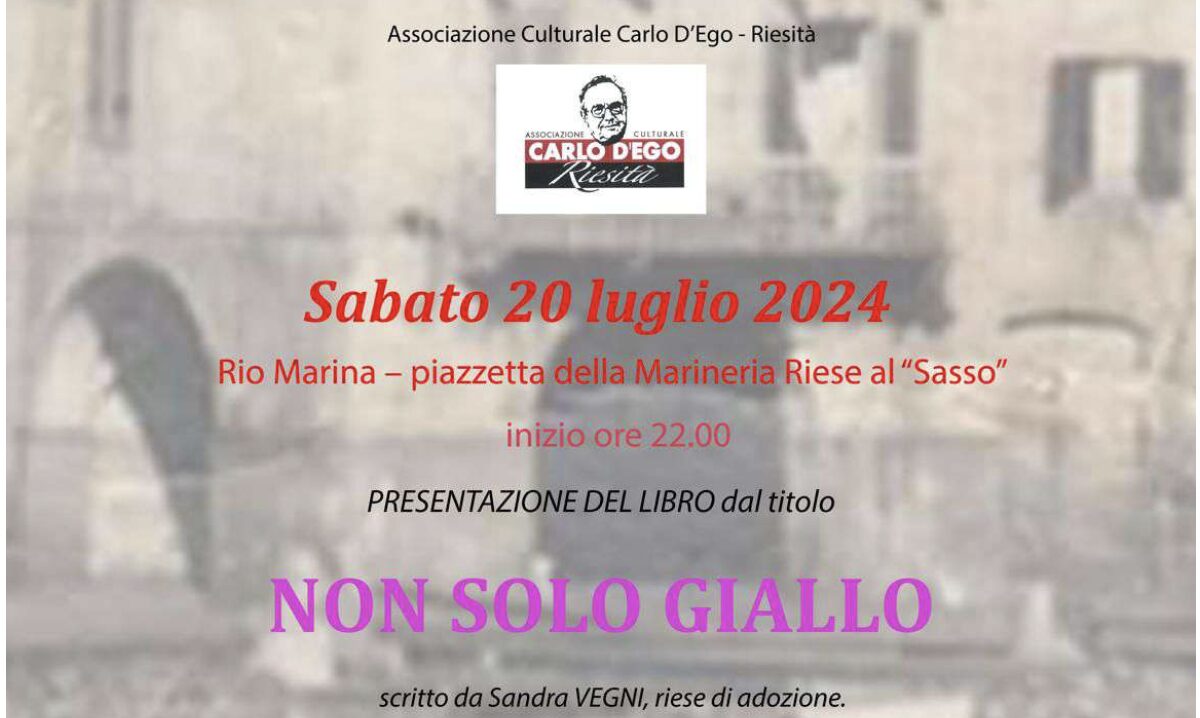 Sabato 20 luglio, con inizio alle ore 22.00, nella suggestiva piazzetta Della Marineria Riese, nel rione “Sasso” a Rio Marina, l’Associazione Culturale Carlo d’Ego Riesità organizza la presentazione del nuovo libro dal titolo NON SOLO GIALLO, scritto da Sandra Vegni.