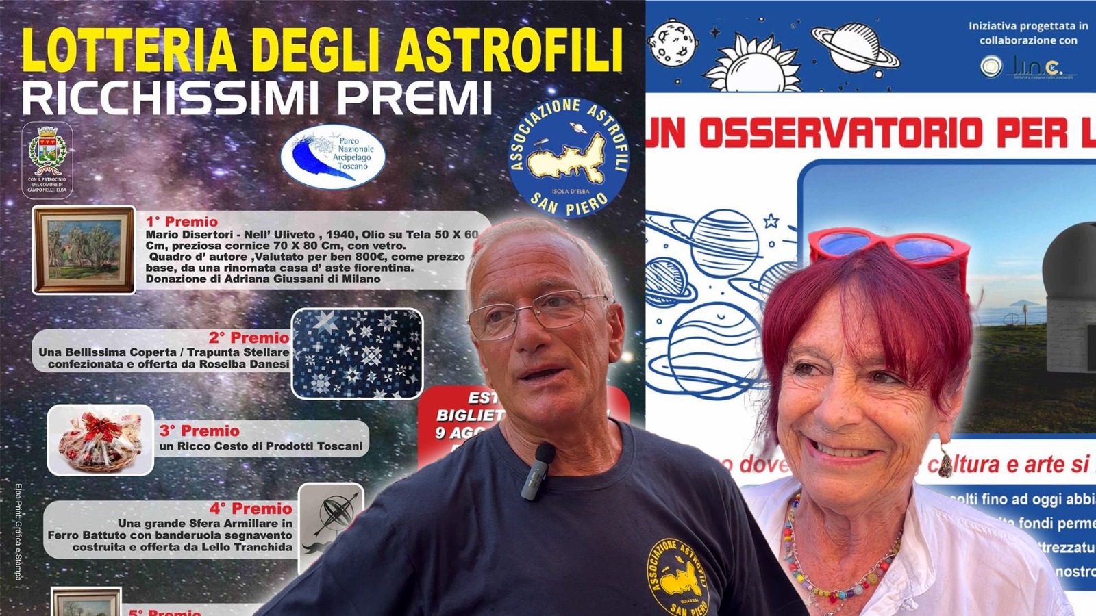 Costruire un Osservatorio Astronomico all’isola d’Elba è l’obiettivo di un progetto tanto importante quanto ambizioso dell’Associazione Astrofili di san Piero che , dopo una prima “astrolotteria” che ha permesso la costruzione della struttura, ne ha organizzata una seconda per acquistare la copertura e i macchinari per l’osservazione del cielo e delle stelle. I biglietti sono in vendita alla gelateria Tiffany di San Piero e El Pimpa di Marina di Campo con la signora Paola grande sostenitrice dell’iniziativa. Un progetto che ha un valore assolutamente da non sottovalutare, quello dell’Osservatorio Astronomico: sarà una risorsa pubblica, aperta tutto l’anno e a disposizione di tutta l’isola, in particolare delle scuole. Ecco le interviste