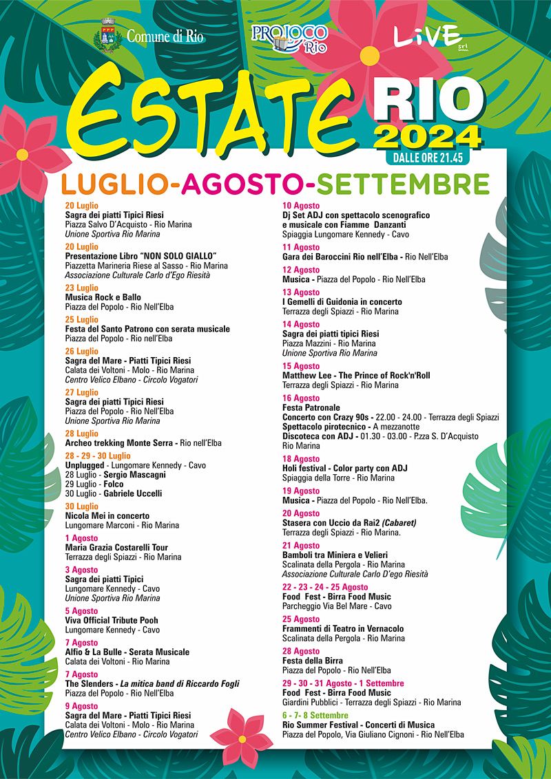 “Abbiamo sempre sofferto il paragone con gli altri Comuni elbani quando si parla di eventi estivi – commenta l’assessore Mattia Guerrini – quest’anno, invece, possiamo affermare con orgoglio che Rio si presenta con la migliore programmazione che prevede tutti eventi di livello e tre grandi appuntamenti che faranno parlare di noi. Il nostro grazie va alla Proloco di Rio, con la quale abbiamo lavorato giorno e notte per arrivare a questo risultato”.