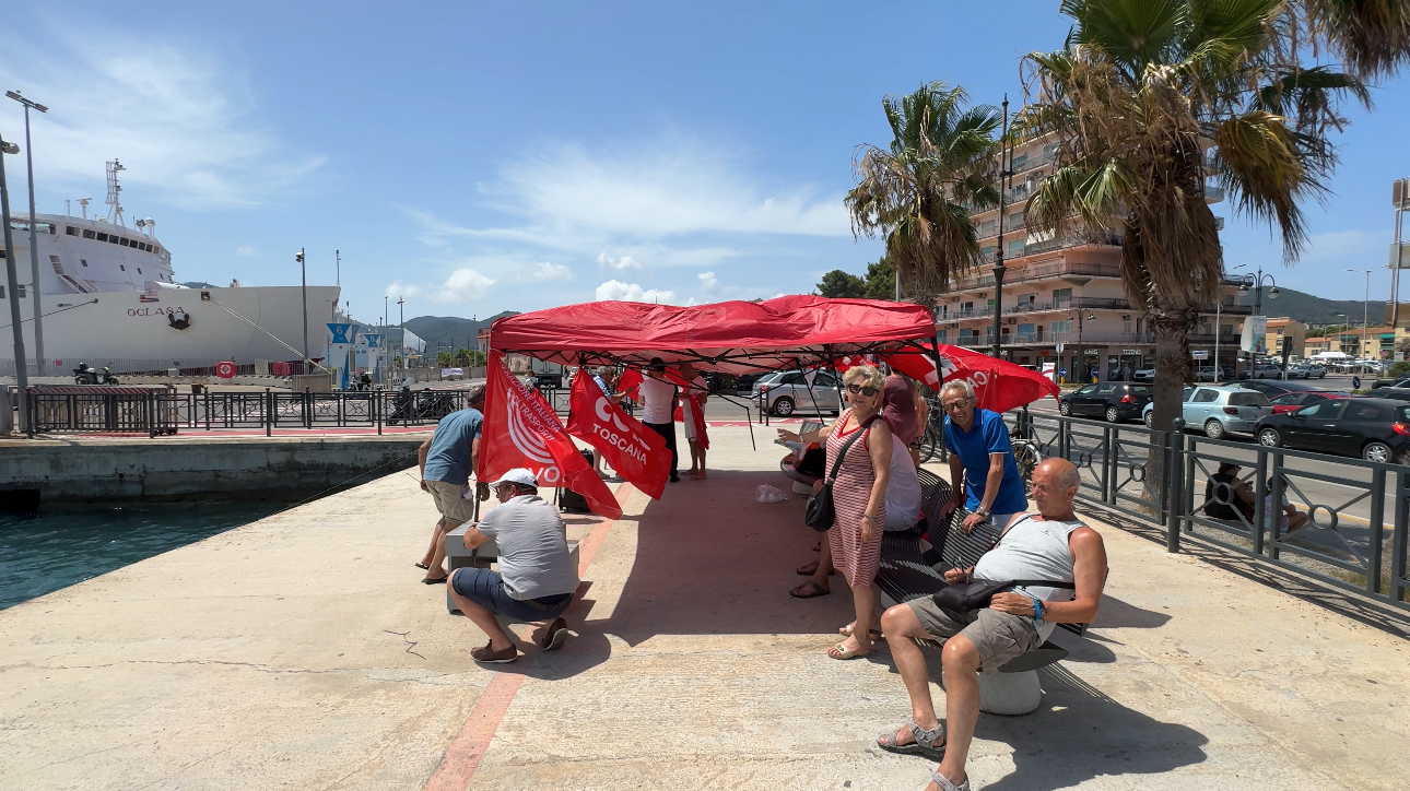 Tutto sommato il resoconto dello sciopero dei marittimi Toremar è positivo, per l’iniziativa e per i pochissimi inconvenienti. Giuseppe Gucciardo segretario generale della Filt Cgil di Livorno, si dice soddisfatto della manifestazione di oggi domenica 21 luglio. “Adesione al 100%, il traffico coordinato. I disagi sono stati contenuti e lo scontro non era con l’utenza. Lo sciopero è stato effettuato per avere visibilità” ha raccontato e non nasconde la possibilità di un nuovo sciopero. Al presidio dei lavoratori Toremar situato in Calata Italia, sotto il gazebo allestito e con un grande caldo, molti lavoratori Toremar, simpatizzanti e rappresentanti del Partito Democratico locale a portare sostegno ai scioperanti. Arrivando al porto di Portoferraio, davanti al portellone chiuso dell’Oglasa, che si è fermata dopo aver effettuato le prime due corse del mattino, uno striscione, che recitava “Toremar, l’unica garanzia per gli elbani”. La situazione è stata complessa, vista l’attività delle altre compagnie di navigazione, ma tutto è andato per il meglio grazie alla capillare organizzazione messa in atto dal Comune di Portoferraio, dalla Protezione Civile e dal coordinamento di tutte le associazioni di volontariato del territorio. Fin dalle prime ore del mattino la Polizia Municipale di Portoferraio, coadiuvata da colleghi provenienti da tutta l’isola, insieme a Polizia, Carabinieri e Guardia di Finanza, ha istituito un presidio di tutte le rotonde e di tutti gli accessi al porto, tanto che il traffico si è svolto regolarmente per tutta la giornata. Nel momento di maggior afflusso sulle banchine, nella parte centrale della mattinata, il traffico veicolare è stato intenso ma comunque regolare. I volontari, pur non essendoci lunghi tempi di attesa all’imbarco, hanno comunque distribuito acqua fresca e generi di conforto ai passeggeri delle auto in coda. Marco Landi (Lega) racconta: ” Non si sa che cosa succederà del bando territoriale per le isola dell’arcipelago. Una negligenza inaccettabile dalla Regione Toscana. Pensiamo che questa protesta sia parallela e vicina a quella che sentono tutti i cittadini dell’Arcipelago Toscano” Della domenica da bollino rosso e dello sciopero Toremar, all’isola d’Elba, si sono interessati anche i Media Nazionali e diversi servizi sono passati sui Tg delle Tv di Stato.