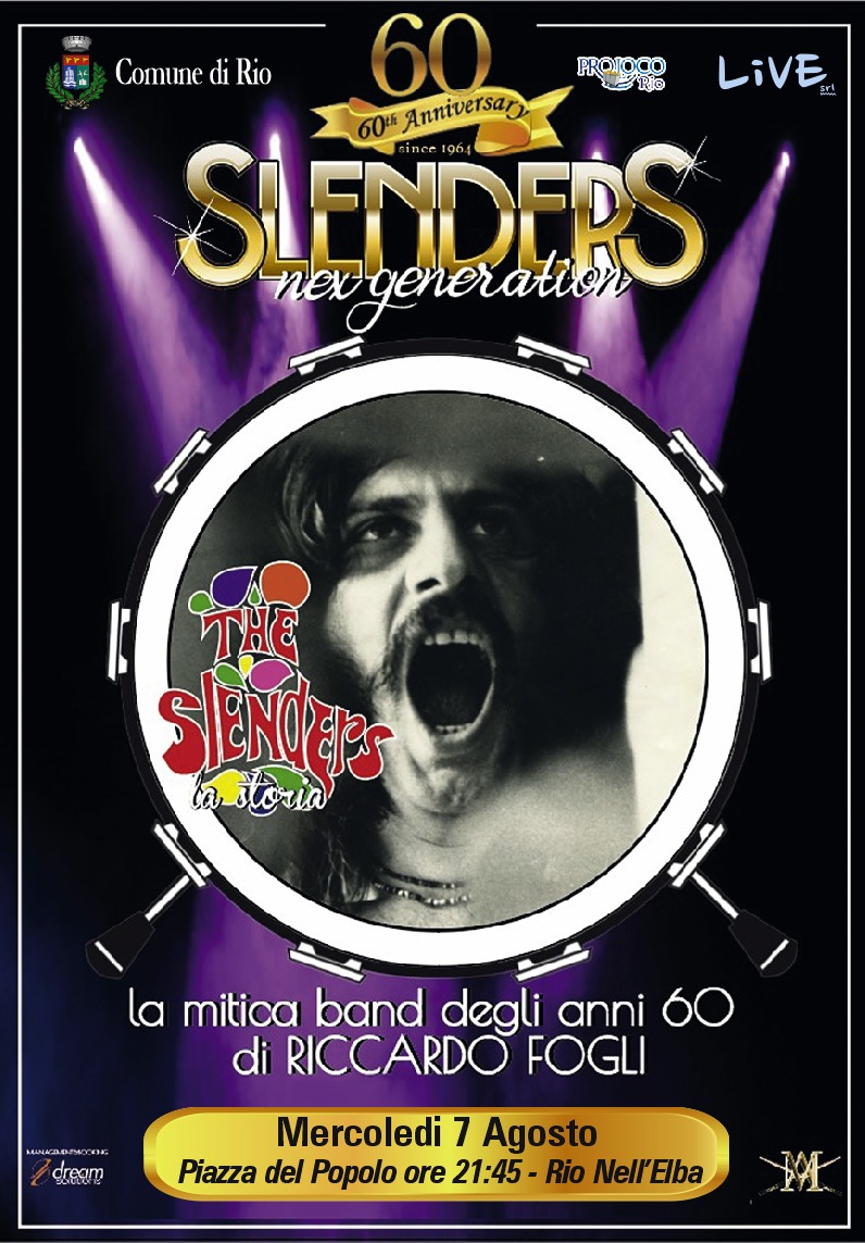 Gli Slenders nascono negli anni 60 da un’idea di un impresario lungimirante Ivo Saggini e di un grande musicista Tullio Anselmi. Siamo nel 1961, nasce il gruppo The Slenders (cioè “Gli Smilzi”). L’esordio nel 1963 alla Rinascita di San Vincenzo, proprio con una delle primissime canzoni dei Beatles, “Please please me”. Seguirono feste di piazza, serate nei locali. Nello stesso anno arriva Riccardo Fogli con un debutto all’Isola d’Elba all’Hotel Hermitage e fu un successo. Il resto è storia Gli Slender con molti alti e pochi bassi, continuano a girare l’Italia portando la musica bella nelle piazze delle più belle località della penisola.