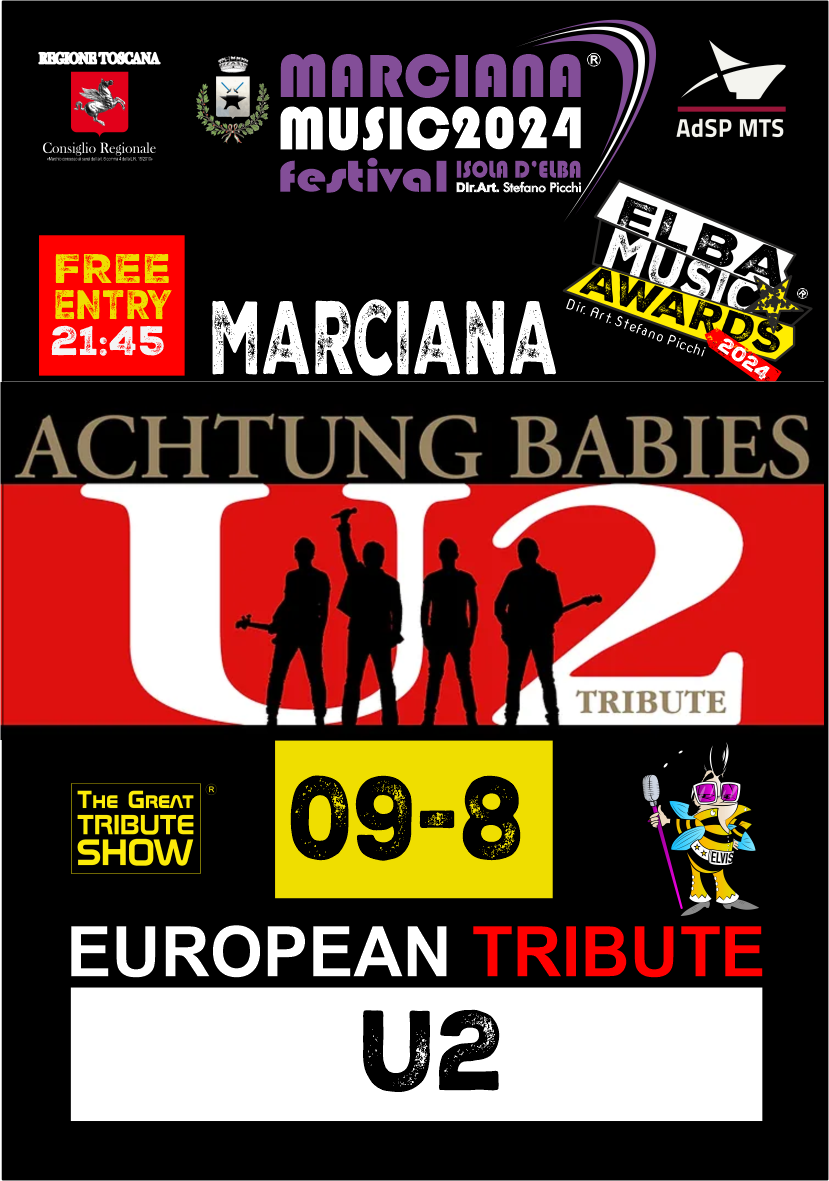 Stasera venerdi 9 agosto a Marciana in piazza For di Portasi esibiranno, gli U2 European Tribute Tour. La band si chiama Achtung Babies, ed è famosissima per essere la prima tribute europea di Bono Vox. Oltre 2000 concerti in carriera. Uno spettacolo da non perdere, prodotto da Elba Music Awards con il Comune di Marciana. Ingresso libero, piazza For di Porta ore 21.45. Navetta dedicata da Marciana Marina per raggiungere il concerto.