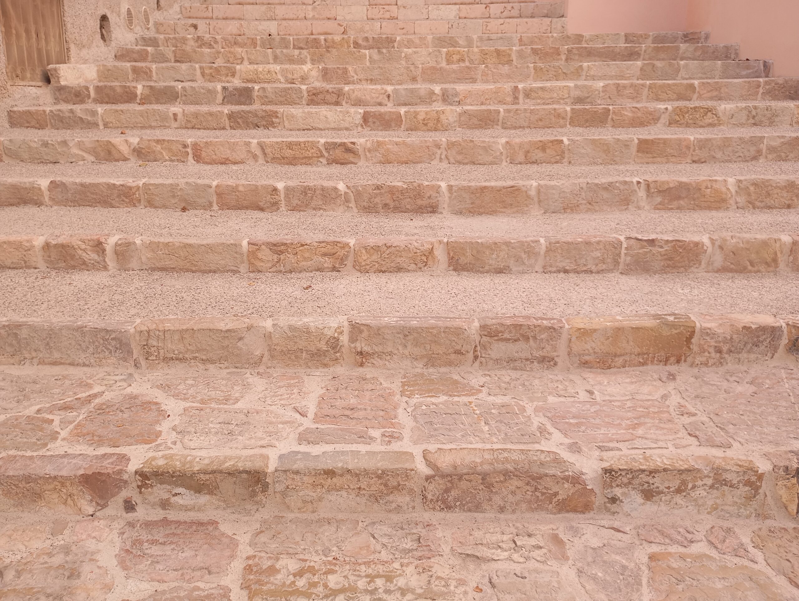 Durante lo scavo sono state rimosse con cura ed accatastate nell’ambito del cantiere per il conseguente riutilizzo , sia le basole ancora presenti della scalinata che i cordoli ancora presenti . Il basolato era presente per una piccola parte e precisamente solo per la metà della scalinata da Via del Carmine all’ingresso di Via dei Palchetti, con esclusione del pianerottolo (anch’esso ricoperto da una gettata di cemento) mentre il resto della scalinata era coperto da cemento , terra battuta , conglomerato cementizio e piccoli rimasugli di “battuto di calce” , mentre i cordoli risultavano presenti solamente per circa metà della superficie della parte sinistra della scalinata , pertanto non erano numericamente sufficienti per la copertura dell’intero tracciato. Il manto della scalinata è stato eseguito, uniformando la parete bassa del percorso, riutilizzando sia le basole che i cordoli recuperati dalla scalinata in precedenza accatastati in cantiere, sia il materiale di recupero conservato presso il magazzino comunale, grazie al quale abbiamo potuto coprire con il basolato e cordoli , una superficie maggiore rispetto a quella originariamente presente sulla scalinata prima dell’intervento”.