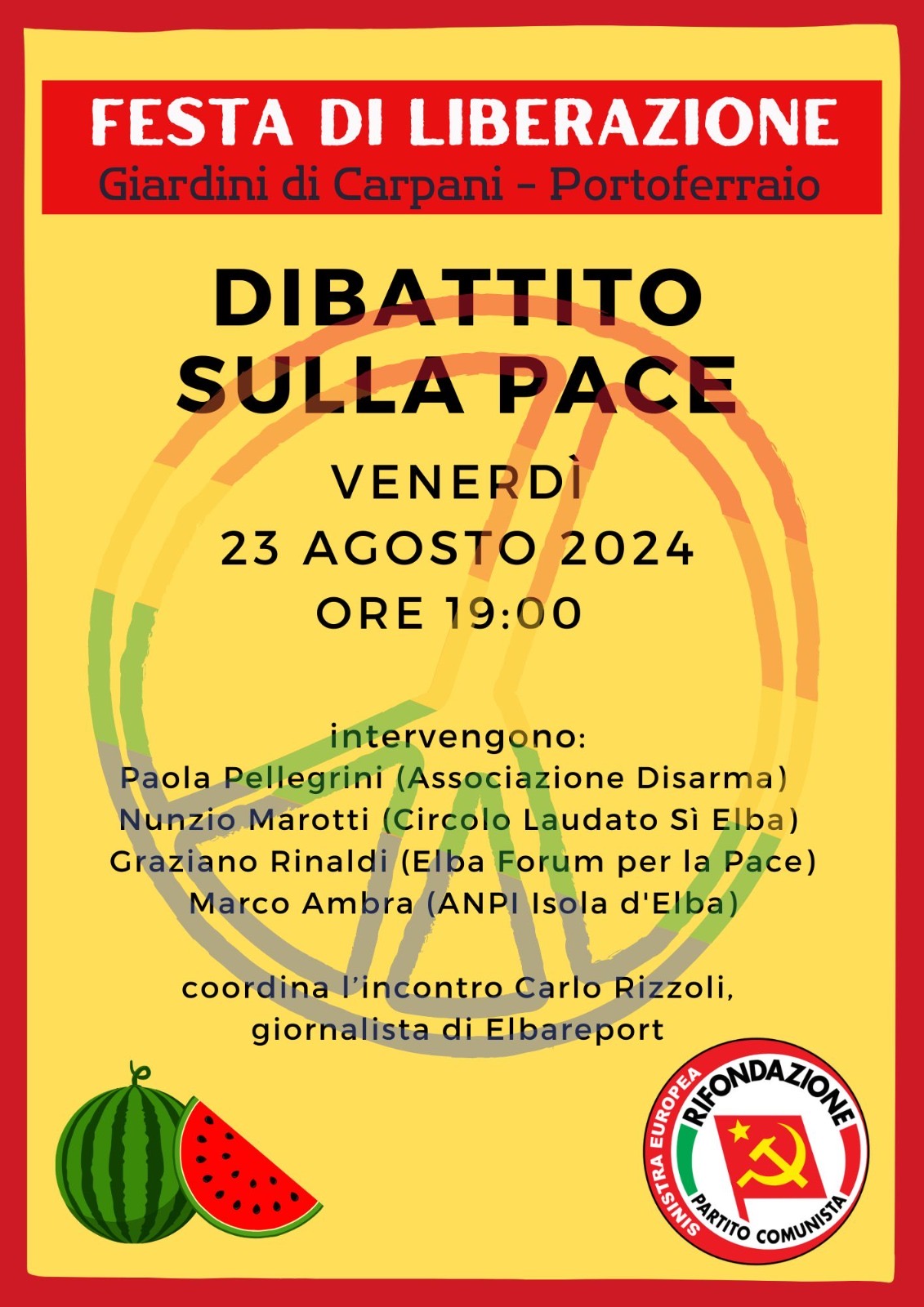 Inizia domani (venerdi’ 23 agosto) la Festa di Liberazione organizzata dal Circolo Isola d’Elba di Rifondazione Comunista presso i giardini di Carpani a Portoferraio. Intenso il programma della prima giornata. Alle 19 incontro-dibattito sul tema della PACE coordinato dal giornalista Carlo Rizzoli e con la partecipazione di Paola Pellegrini (Associazione Disarma); Nunzio Marotti (Circolo Laudato Si’ Elba), Graziano Rinaldi (Elba Forum per la Pace) e Marco Ambra (ANPI Isola d’Elba).