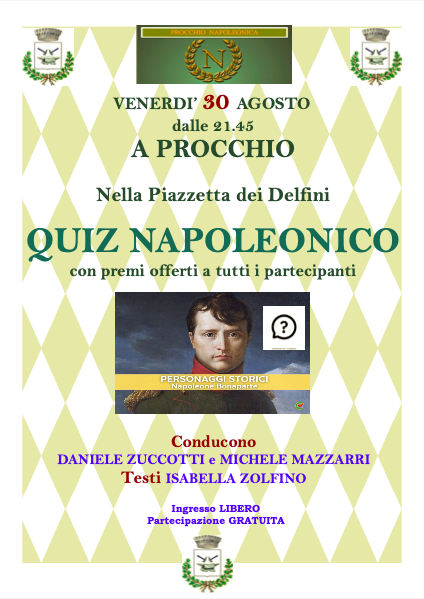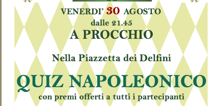 Domani sera, 30 agosto, dalle 21.45 a Procchio, in Piazzetta dei Delfini, seconda serata per il 2024 del Quiz Napoleonico, un format ideato dall’Associazione Culturale Procchio Napoleonica, che è molto piaciuto nelle precedenti edizioni, tanto da dover far realizzare due edizioni, una ai primi di luglio e questa di fine agosto.