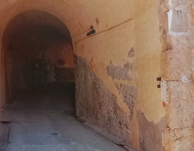 (Portoferraio.Ingresso esterno di Porta di Terra e “ …il traghetto di ambulazione di detta Porta ,tanto che passa per tutta la grossezza ed estensione di detto bastione della Cornacchia ,fu tagliato nello scoglio vivo con maraviglia di chiunque lo vede …”.Questa è la “tromba”,la galleria o paterna ,in parte cementificata e con piano di calpestìo asfaltato)