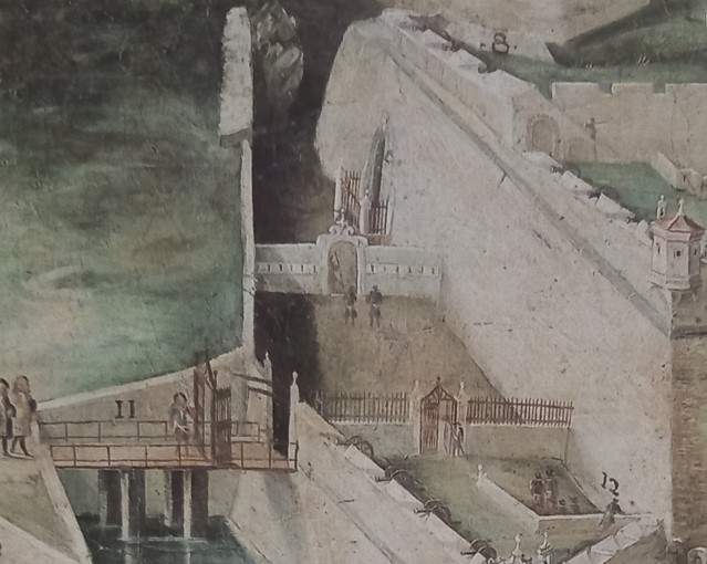 “…Sotto il bastione della Cornacchia vi era una palizzata con un semplice rastrello per dove si entrava ,il che non piacendo all’Ingegnere per essere cosa troppo semplice ,vi fece una controguardia con il suo fosso e dentro ad esso il suo corpo di guardia.