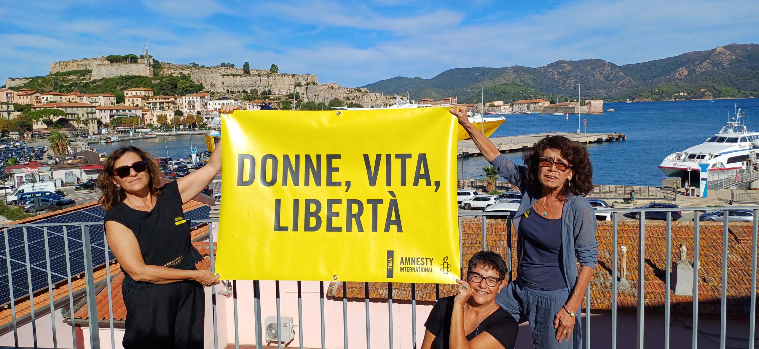 Nei giorni scorsi, con un gesto simbolico, le attiviste di Amnesty International hanno allestito e fotografato in varie zone di Portoferraio uno striscione con la scritta “Donna, Vita, Libertà”, lo slogan che ha dato inizio alla grande manifestazione di protesta nata in Iran dopo la morte di Mahsa Amini e che ha poi coinvolto tutto il mondo in segno di solidarietà e difesa delle donne iraniane.