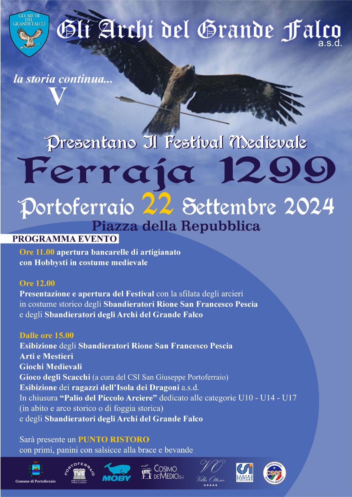 Gli Archi del Grande Falco asd,sono lieti di ripetere il Festival Medievale “Ferraja 1299” in Piazza della Repubblica il 22 settembre arrivato alla quinta edizione , con musici e sbandieratori di Pescia , figuranti, giochi medievali, Hobbisti elbani , gli scacchi con l’associazione elbana degli Scacchi di San Giuseppe Csi , i ragazzi de L’Isola dei Dragoni asd e la storica gara per i giovani del Palio del Piccolo arciere.