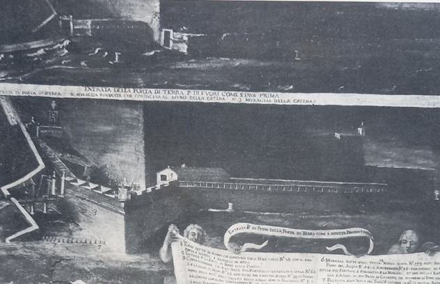 Tutto il bastione delle Fascine o tenaglia è visibile nel particolare del dipinto “Prospettiva di Portoferraio “ del 1705 circa.