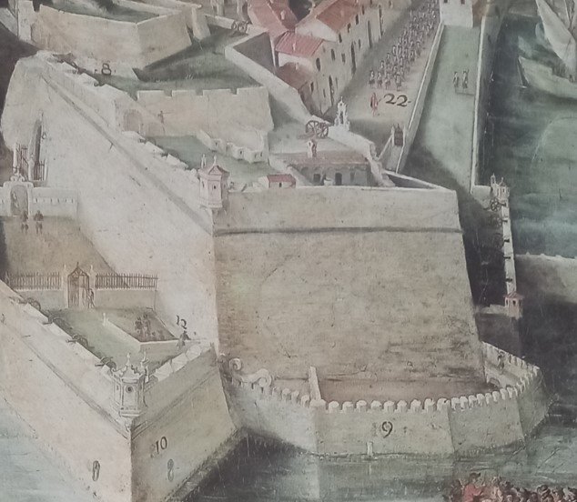 PARTICOLARE. Al centro il bastione della Cornacchia.Sulla sua sinistra la controguardia sotto al Porta di Terra ,sulla sua destra il bastione del Cornacchino con muro da cui si diparte la catena a chiusura della darsena.Ai piedi del bastione della Cornacchia è il bastione della Fascine con davanti piantato in mare il palo per ormeggiare le barche)