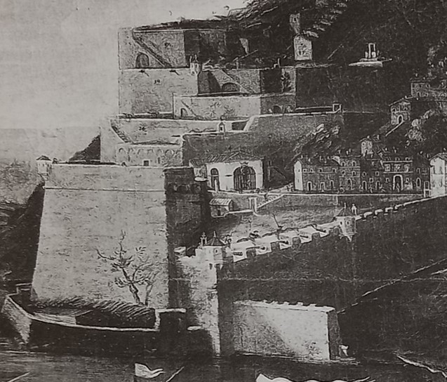 PARTICOLARE .Bastione della Cornacchia e del Cornacchino da cui si s diparte il muro a cui è attaccata la catena che serra l’ingresso nella darsena.Sotto li Bastione della Cornacchia e Cornacchino è la muraglia del Bastione della Fascine che circonda a tenaglia i suddetti bastioni)