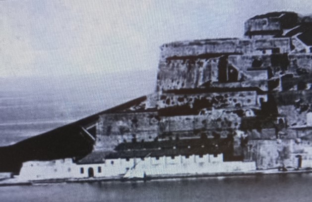 “….Rifatta una muraglia ,che comincia dalla detta controguardia e finisce al muro ove si lega la catena .Longa b.a 160 ,alta b.a 9 e mezzo con le feritoie e panchette per la moschetteria ,et una piccola batteria ,per due pezzi di cannone ,che tira a fior d’acqua in bocca della darsena,opposta alla Torre…Piantata una grossa colonna in mare fuori di detta muraglia per legare le barche…”