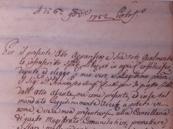 Per il presente atto apparisca e sia noto qualmente ,io infrascritto spontaneamente li presento ed in ogni caso costituisco deposito ed eleggo per mio vero e legittimo procuratore il Signor Dottore Francesco Angelo Rutigni qui di questa città dall’atto assente ma come presente ed in tal mandato legittimamente accetta in nome e vece mia presentarsi alla Cancelleria di questo Magistrato Comunitativo,promettere s stare mallevadore e come principale principalmente insieme insolidum tenuto ed obbligato a favore di questa Comunità per ogni e qualunque danno che medesima risentirà potesse dall’Amministrazione ed impiego di Camarlingo di essa da esercitarsi da Gio Batta Corsi per un’anno e prestare a tale effetto ogni opportuno e necessario giuramento e quanto altro