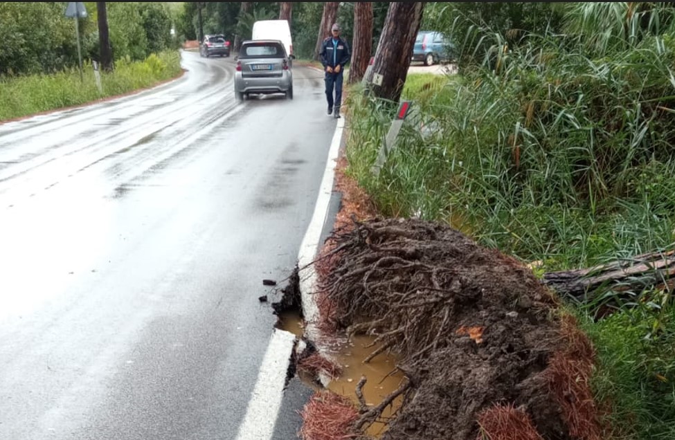 Il problema è stato creato dalle radici del pino che, nell’uscire dalla loro sede per la caduta, hanno aperto sotto la strada una voragine che, secondo i calcoli dei tecnici del Comune, si spinge di circa 80 centimetri verso il centro della carreggiata stessa, creando un vuoto che con il transito dei veicoli potrebbe causarne lo sprofondamento.