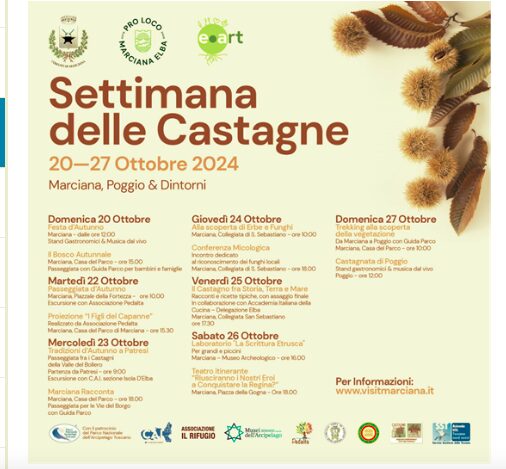 L’appuntamento con i profumi e i sapori dell’autunno elbano – ormai giunto alla quinta edizione – presenta una settimana ricca di eventi: le tradizionali sagre (Festa d’Autunno a Marciana e Castagnata a Poggio), numerose escursioni e passeggiate, laboratori, musica, teatro ed incontri culturali.
