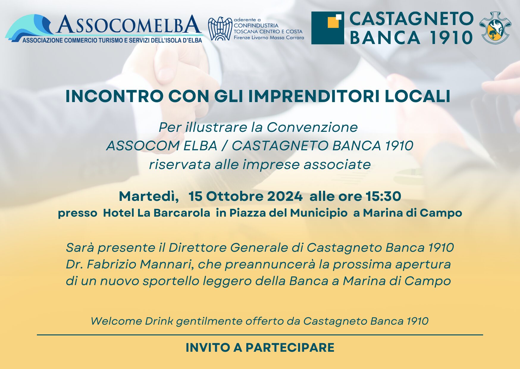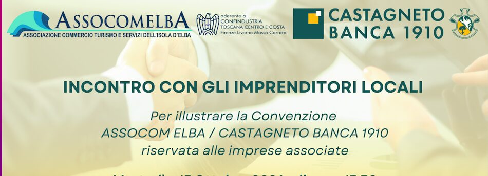 La Convenzione stipulata tra Castagneto Banca ed AssoCom Elba aderente a Confindustria Toscana Centro e Costa, recentemente rinnovata, verrà presentata a tutti gli imprenditori di Campo nell’Elba e dintorni con un incontro dedicato, che si terrà Martedì 15 ottobre p.v. alle ore 15.30 nella sala convegni dell’Hotel Barcarola in Piazza del Municipio a Marina di Campo.