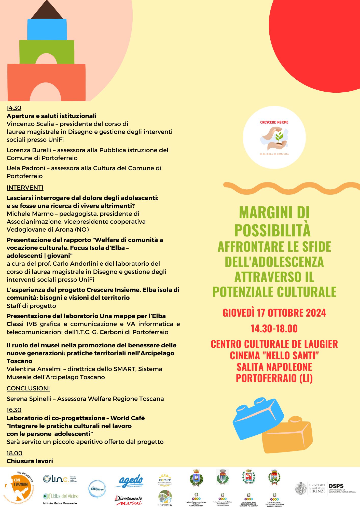 “Margini di possibilità. Affrontare le sfide dell’adolescenza attraverso il potenziale culturale”. È fissato per giovedì 17 ottobre alle ore 14:30 presso il centro culturale De Laugier di Portoferraio il nuovo appuntamento aperto a tutti del progetto Crescere Insieme. Elba isola di Comunità*