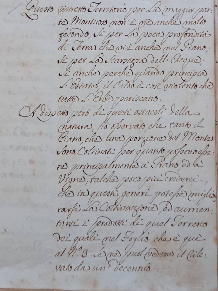 Nel settecento,il territorio che circonda Portoferraio non produce grano a sufficienza per i bisogni comunitari  perché “questo ristretto territorio per la maggior parte montuoso  non è neanche molto fecondo sì per la poca profondità di terra che vi è anche nel piano,sì’ per la scarsezza delle acqua ; sì anche perché quando principia l’estate ,il caldo è così violento che tutte le erbe spariscono .A dispetto però di questi ostacoli della natura  ho osservato che tanto il piano che una porzione del Monte sono coltivati per quanto possono essere principalmente a grano ed a vigne ,talchè poco più crederei che in questi  generi potesse migliorarsi l coltivazione ed aumentarsi i prodotti di quel terreno dei quali nel foglio che è qui al n 3 se ne può vedere il rilevato da un decennio”