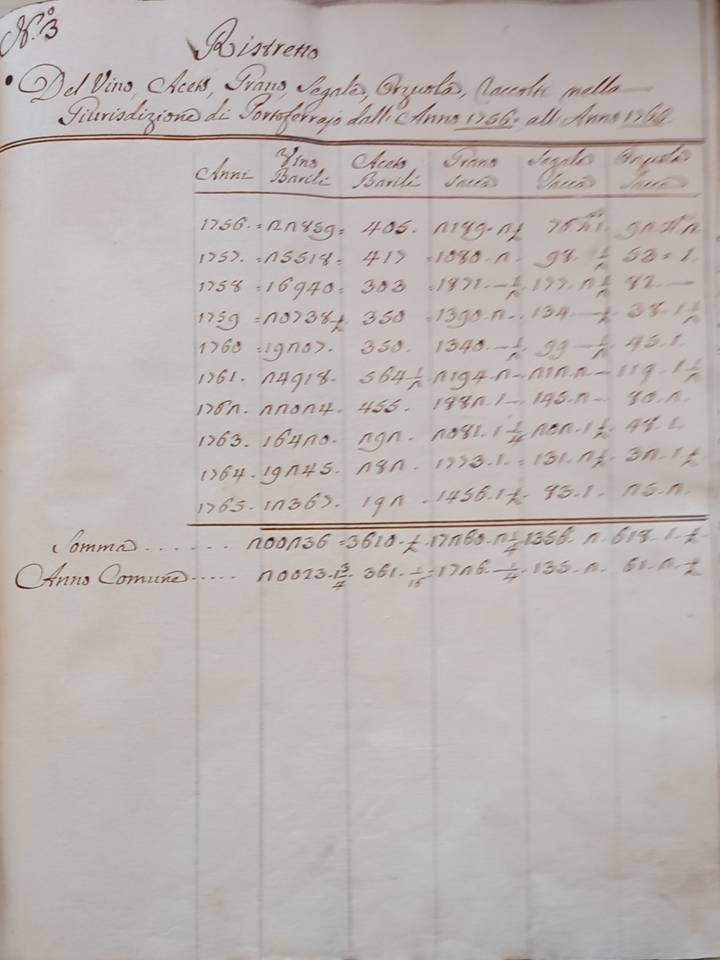 Il foglio n 3 che l’Alberti allega alla sua relazione è il “Ristretto del vino ,aceto,grano,segale ,orzuola raccolti nella giurisdizione di Portoferraio dall’anno 1756 all’anno 1765”.Questo documento è una  sintetica (ristretto) dettagliata relazione su alcuni generi alimentari prodotti  in loco a Portoferraio per un decennio del settecento