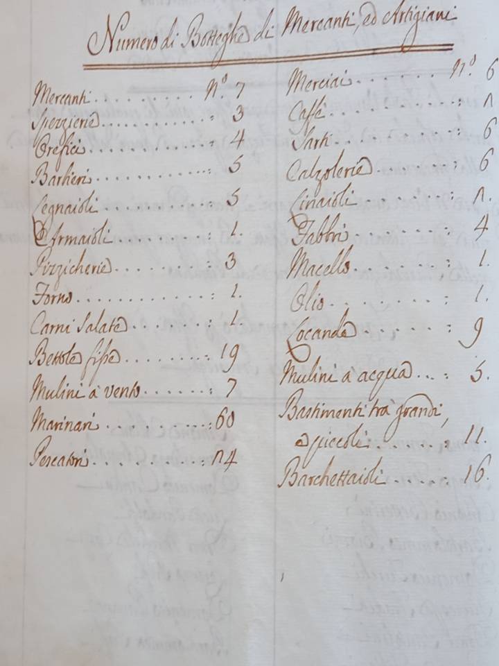 (“Numero di botteghe di Mercanti ed Artigiani “  in “Relazione di Portoferraio fatta a Sua Altezza Reale dal conte Vincenzo degli Alberti  suo Consigliere di Stato” Vincenzo degli Alberti.Manoscritto. Biblioteca comunale di Portoferraio. 1766).