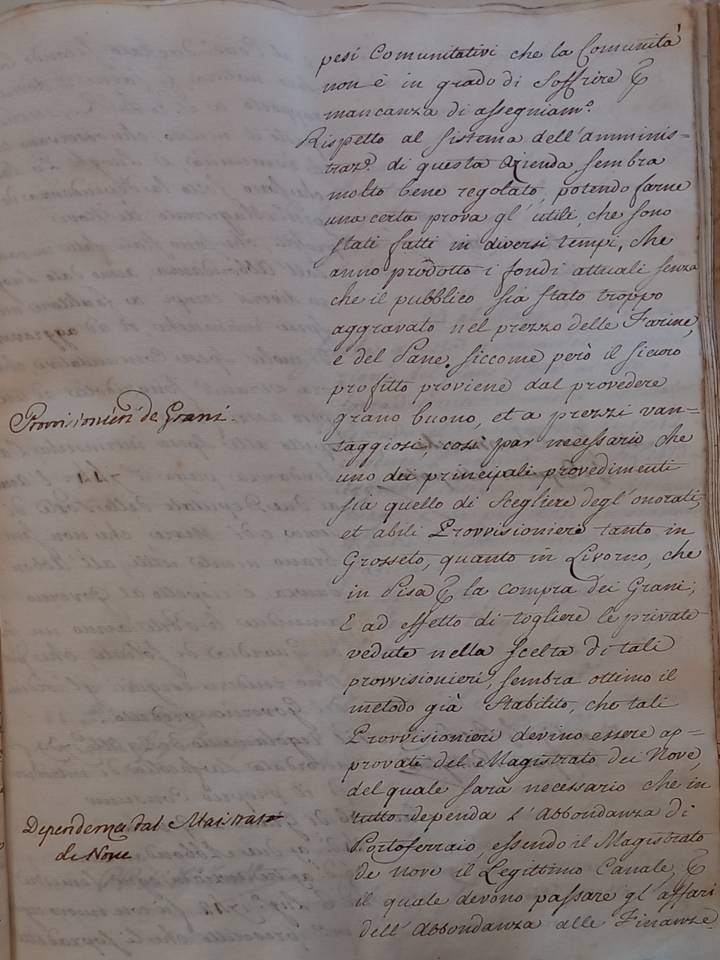 Dei provisionieri dei grani ne parla Alberti nel suo manoscritto nella memoria sopra l’Abbondanza di Portoferraio  “…Rispetto al sistema dell’Amministrazione di quasta Azienda sembra molto bene regolato potendo farne una certa prova gl’utili  che sono stati fatti in diversi tempi che hanno prodotto i fondi attuali senza che il pubblico sia stato troppo aggravato nel prezzo delle farine e del pane .Siccome però il sicuro profitto proviene dal provvedere grano buono et a prezzi vantaggiosi  così par necessario che uno dei principali provvedimenti  sia quello di scegliere degli onorati et abili Provvisionieri tanto in Grosseto  quato in Livorno che in Pisa per la compra dei grani ; e ad effetto di togliere le private vedute nella scelta di tali provvisionieri sembra ottimo il metodo già stabilito che tali provvisionieri  devino essere approvati dal Magistrato dei Nove del quale sarà necessario che  in tutto dipenda l’Abbondanza di Portoferraio essendo il Magistrato dei Nove i legittimo canale per il quale devono passare gli affari dell’Abbondanza o al Consiglio di Stato ,secondo la  loro natura ,per farne il dovuto rapporto a S.A.R. ,essendo questo il metodo  che osservano tutte le Comunità  e luoghi Pii Laicali che sono sotto la dependenza del predetto Magistrato dei Nove…”