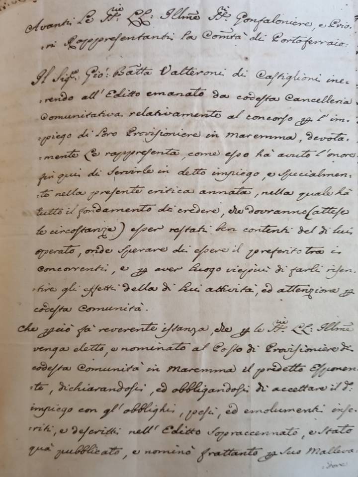 Il Sig Gio Batta Valteroni di Castiglioni inerendo all’editto emanato da codesta Cancelleria Comunitativa relativamente al concorso per l’impiego di loro provvisioniere in Maremma ,devotamente Le rappresenta come esso ha avuto l’onore fin qui di servirle in detto impiego e specialmente nella presente critica annata nella quale ha tutto il fondamento di credere ,che dovranno(attese le circostanze)esser restati ben contenti del di lui operato,onde sperare di essere il preferito tra i concorrenti e per aver luogo viepiù risentire gli effetti della di lui attività  ed attenzione per codesta comunità.