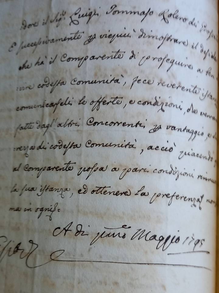 E successivamente per viepiù dimostrare il desiderio che ha il Comparente a ben servire codesta comunità ,fece reverente istanza  comunicateli le offerte e condizioni che venivano fatte da altri  Concorrenti  per vantaggio e sicurezza di codesta Comunità  acciò piacendo quelle al Comparente possa a pari condizioni rinnovare la sua istanza ed ottenere la preferenza