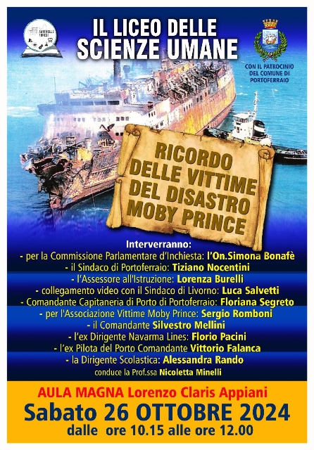 Sabato prossimo 26 ottobre dalle 10.15 alle 12 nell’aula magna del liceo delle scienze umane sulla scalinata Napoleone a Portoferraio le studentesse e gli studenti dell’indirizzo scolastico dell’Isis Foresi ricorderanno una delle tante tragedie Italiane senza ancora una verità certa e sempre attuale. Il disastro del Moby Prince avvenuto appena a 3 km dal porto di Livorno il 10 Aprile 1991 tra il traghetto in uscita dal porto che prese in pieno la petroliera Agip Abruzzo ferma in rada e il conseguente incendio fu la causa della morte di 140 persone tra passeggeri ed equipaggio del traghetto tranne un marittimo sopravissuto che riuscì a lanciarsi in mare e salvato dalla pilotina degli ormeggiatori. All’epoca il traghetto sulla tratta Livorno – Olbia era di proprietà della compagnia di navigazione Navarma che in seguito diventò Moby Lines, quindi una tragedia che ci tocca da vicino perché accaduta a poche miglia dalla nostra isola e anche perché quella grande balena blu dipinta sulle fiancate di quel traghetto a noi molto familiare come tutti quei passeggeri e quei marittimi che quotidianamente si spostano o lavorano in mare, le vittime più giovani furono due sorelline, Sara di 6 anni e Ilenia di un anno che andava a conoscere suo nonno in Sardegna per la prima volta , ognuno con una sua storia e che gli studenti del liceo delle scienze umane vogliono ricordare e riscoprire con l’aiuto degli ospiti alla cerimonia. Interverranno: L’onorevole Simona Bonafè che ha accettato l’invito degli studenti, interviene per la commissione parlamentare di inchiesta del Moby prince, il sindaco di Livorno Luca Salvetti che all’epoca fu uno dei primi giornalisti ad arrivare al porto per il tg di granducato, il comandante della capitaneria di porto di Portoferraio Floriana Segreto, Sergio Romboni che quella sera perse il suo papà appassionato di rallye che andava a vedere il mondiale “costa smeralda” , parteciperannno Vittorio Falanca pilota di porto in pensione, Silvestro Mellini comandante in pensione, Florio Pacini all’epoca dirigente della compagnia di navigazione Navarma. Interverranno anche il Sindaco di Portoferraio Tiziano Nocentini e l’assessore all’istruzione Lorenza Burelli. Aprirà la cerimonia la dirigente scolastica Alessandra Rando con il saluto e il benvenuto agli ospiti. Condurrà la professoressa Nicoletta Minelli