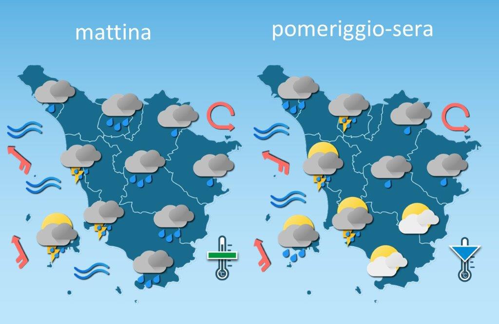Le previsioni più aggiornate di Lamma meteo Toscana: cielo molto nuvoloso o coperto con precipitazioni sparse, più frequenti sulle zone costiere e occidentali dove potranno assumere localmente carattere di rovescio e temporale.