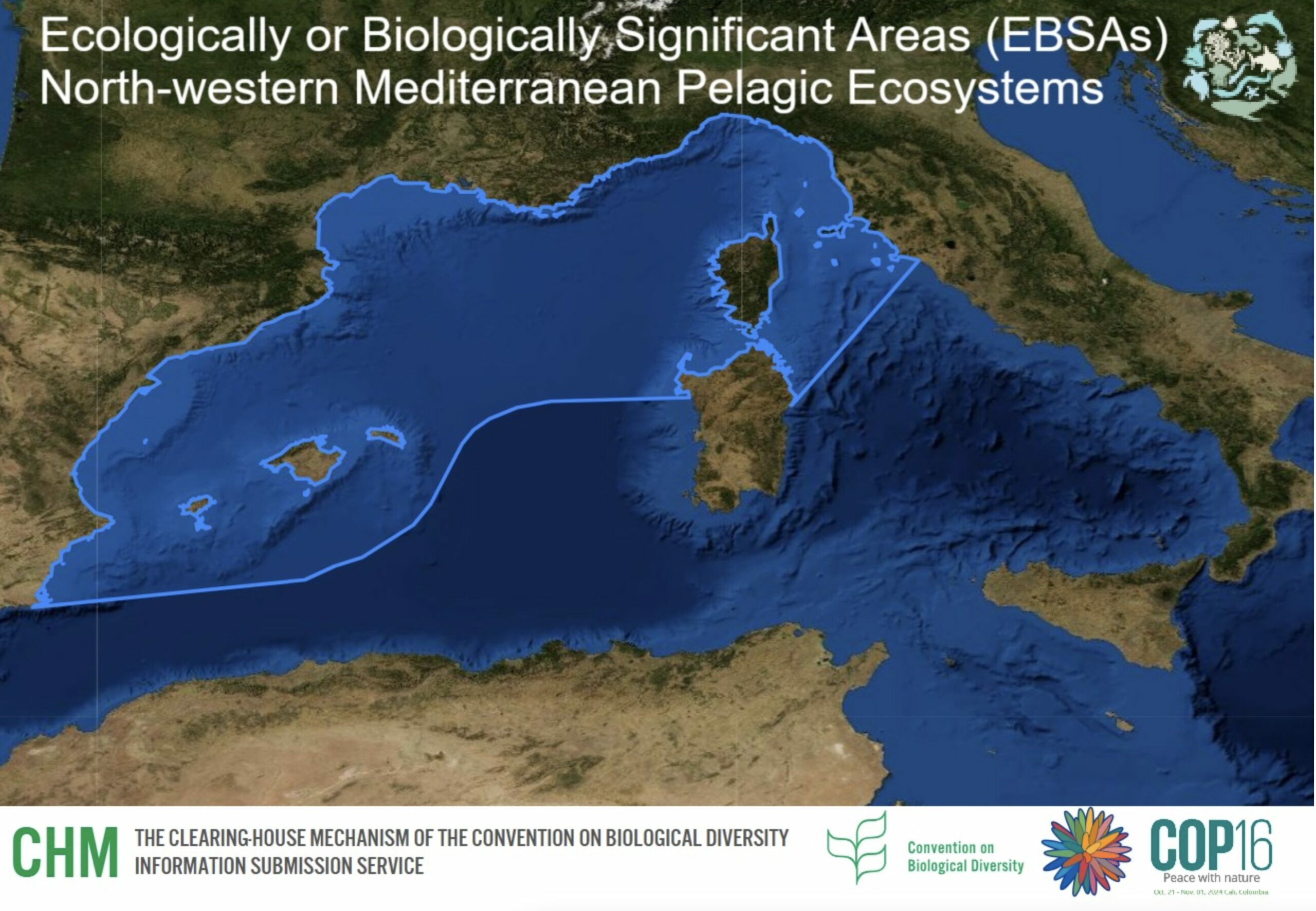 Nella scheda della Ecologically or Biologically Significant Area (EBSA) riguardante i North-western Mediterranean Pelagic Ecosystems (Ecosistemi pelagici del Mediterraneo nord-occidentale), pubblicata il 16 agosto 2016 e che è stata approvata alla COP16 CBD si legge che «L’area è caratterizzata da un insieme di caratteristiche geomorfologiche e oceanografiche che le consentono di ospitare specie di mammiferi marini a livelli relativamente eccezionali di diversità e abbondanza di specie. L’oceanografia delle masse d’acqua nell’area è alla base della sua produttività e della sua straordinaria importanza biologica ed ecologica. Per alcuni gruppi di grandi pelagici, tra cui tonni e specie simili a tonni, il Mediterraneo occidentale rappresenta un’importante area di riproduzione e alimentazione. Le tartarughe marine (Caretta caretta e Dermochelys coriacea) dall’Atlantico e C. caretta dal Mediterraneo orientale e centrale sono distribuite nella parte settentrionale dell’isola e nel Mar Catalano. Le isole Baleari rappresentano un’area di contatto delle due popolazioni di tartarughe. L’area comprende anche circa 63 Important Bird Areas, con importanti popolazioni di berta delle Baleari endemica e gabbiano corso. L’area comprende il Santuario Pelagos e 2 SPAMI precedentemente proposte come il Golfo del Leone e le Isole Baleari meridionali. Contiene anche diverse SPAMI (Area specialmente protetta di interesse mediterraneo – ASPIM, o Specially Protected Areas of Mediterranean Importance) e IBA (Important Bird Areas), basate sull’elevato valore ecologico e biologico dell’area. Una caratteristica centrale dell’area è il Bacino Provenzale-Corso-Ligure, che è delimitato dal sottobacino delle Baleari a ovest, dalla costa continentale europea con il suo Golfo del Leone e il Mar Ligure a nord, dalla costa italiana e dal Mar Tirreno a est e dal Mar d’Algeria a sud. L’area comprende anche grandi isole, come la Corsica, l’Arcipelago delle Baleari e l’Arcipelago Toscano e un’area molto ampia con acque costiere e aperte, importante per i movimenti migratori, l’alimentazione e la riproduzione di diverse specie di grandi pesci pelagici, come il tonno rosso e il pesce spada, nonché specie minacciate di tartarughe marine, mammiferi marini e uccelli marini (gabbiano corso e berta delle Baleari). Il promontorio delle Baleari è una caratteristica importante del bacino del Mediterraneo occidentale che è lungo 348 km, largo 105 km e elevato tra 1000 e 2000 m sopra i bacini marini circostanti (Acosta et al., 2001a, 2002, 2004b). Le isole Baleari rappresentano il confine naturale tra due sottobacini del Mediterraneo occidentale e il sottobacino algerino (situato nella parte meridionale) e il bacino delle Baleari (situato a nord)».