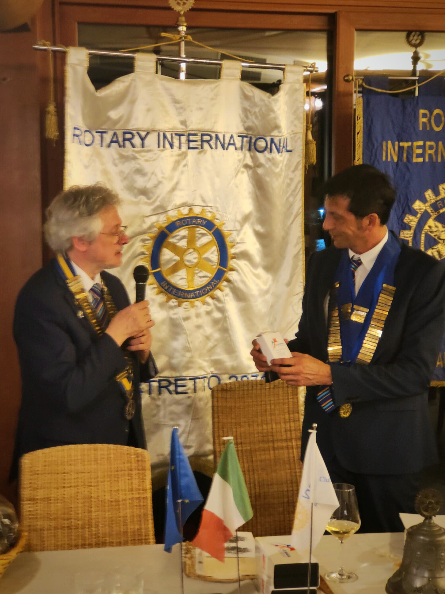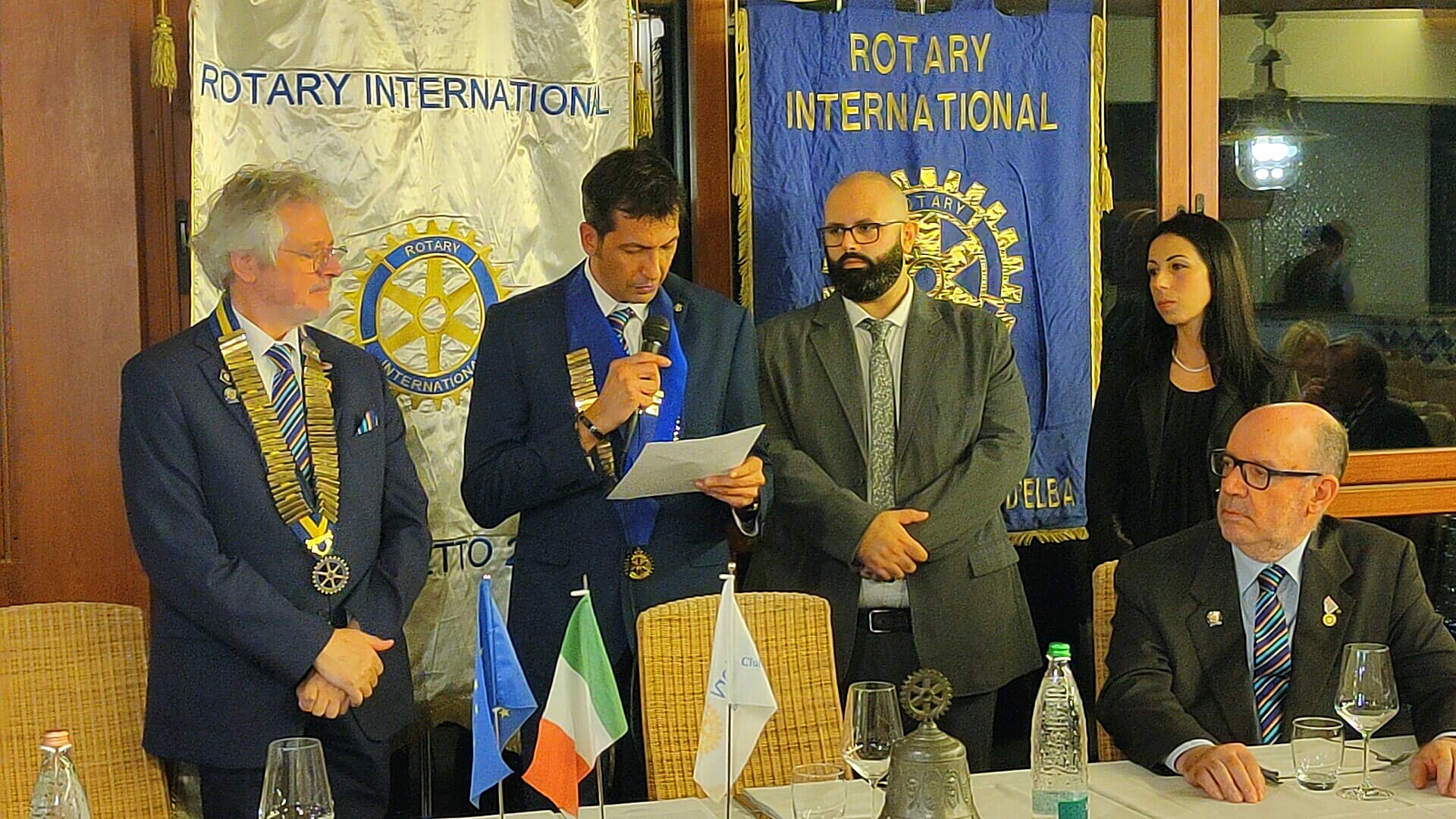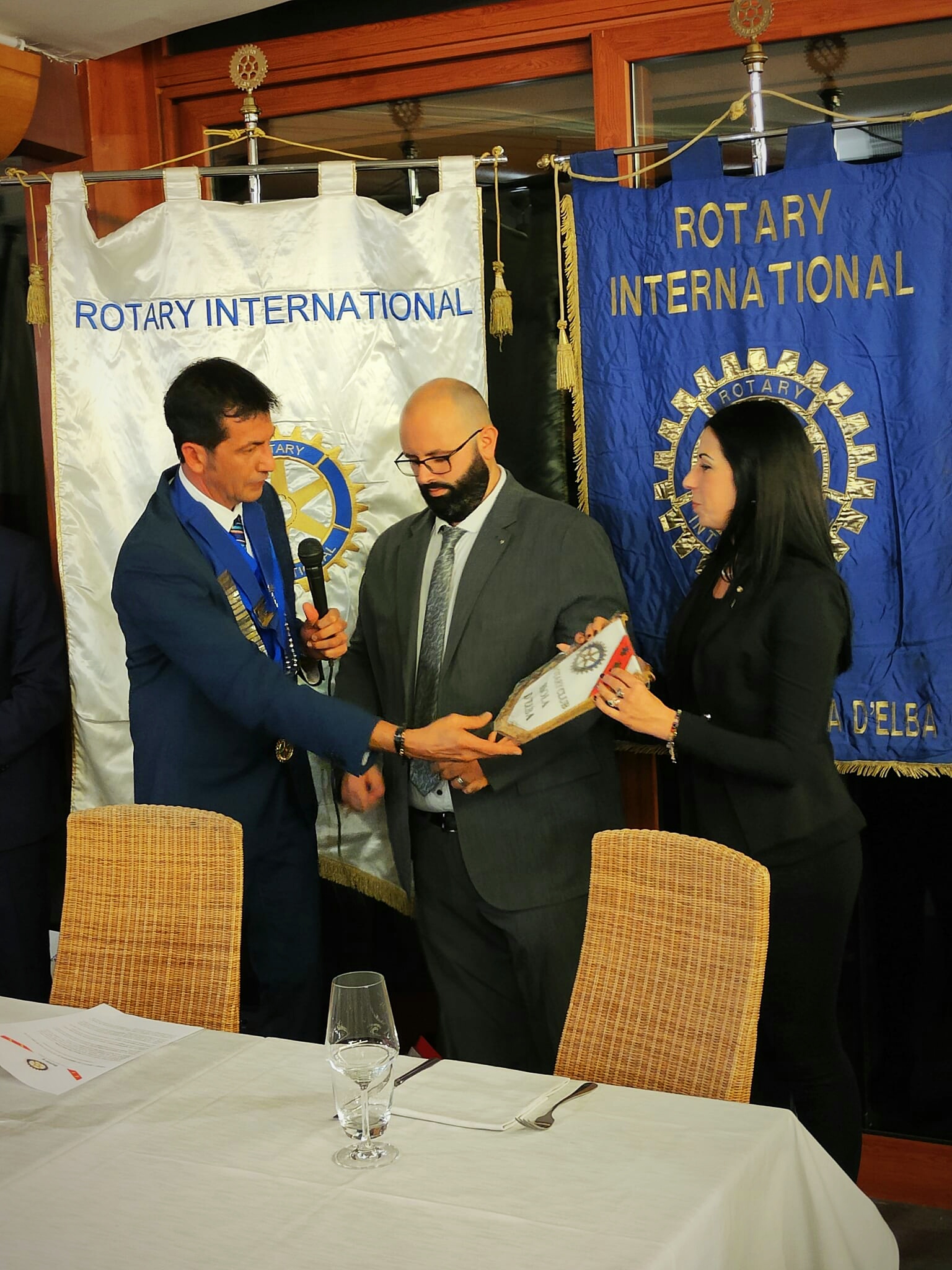 Il Presidente Davide, dopo aver letto la formula rituale di ammissione al Club, ha passato dapprima la parola ai soci che li hanno proposti: Paride Paolini per Federico e Tiziano Nocentini per Rita che hanno presentato i due nuovi soci elencandone le qualità e le caratteristiche che ben si identificano con gli scopi del Rotary. Quindi ha ceduto il posto al Governatore che oltre alla consueta spillatura ed alla consegna dei materiali rotariani di benvenuto, ha invitato i soci tutti ad accogliere Federico e Rita con lo spirito di amicizia che contraddistingue la nostra associazione.