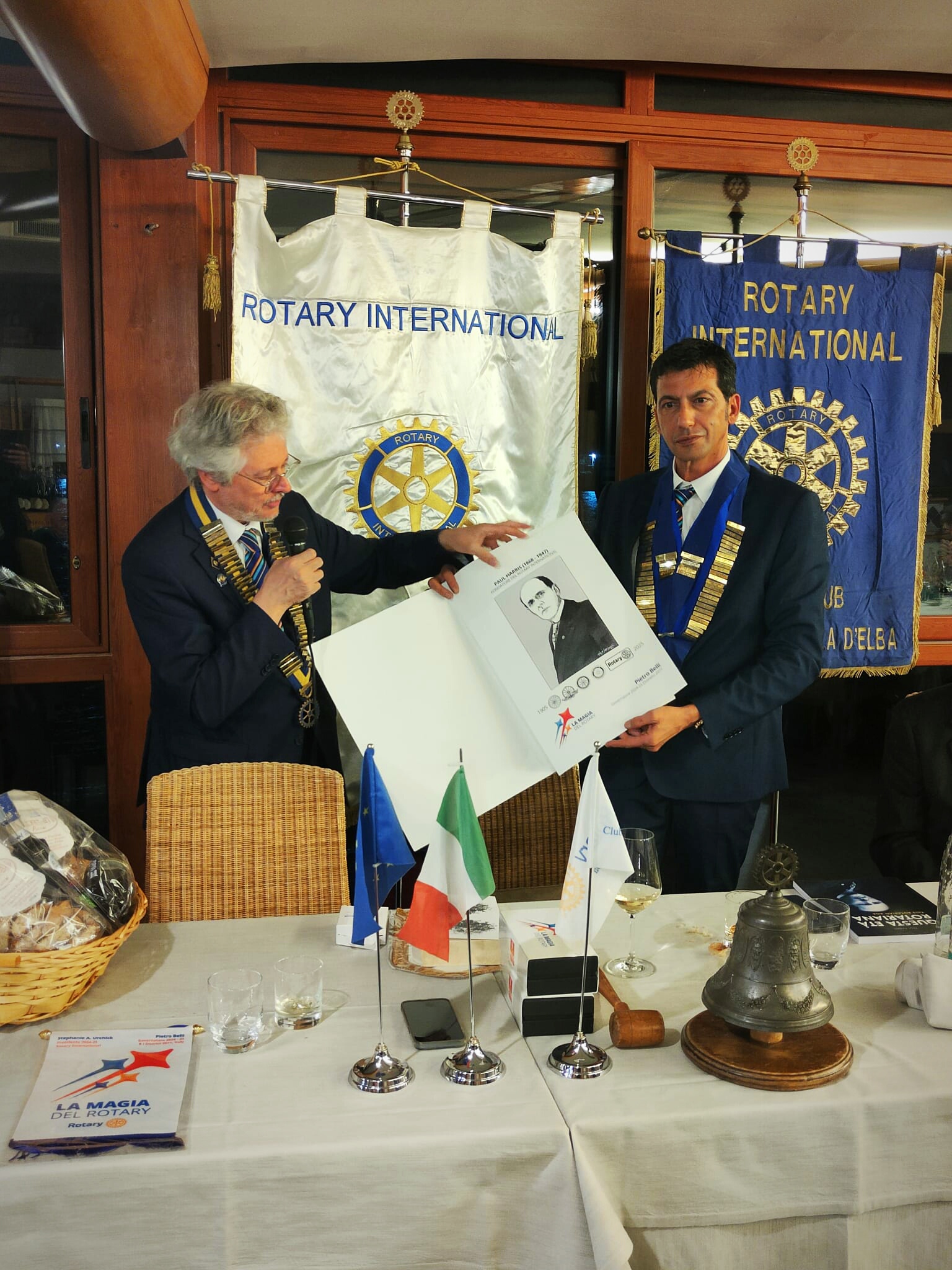 Al termine della serata ha avuto luogo il consueto scambio di doni; in particolare il Governatore Pietro Belli ha donato al Club il libro “Questa età rotariana” e una stampa di Paul Harris, il fondatore del Rotary. Contraccambiando il gesto, il club elbano ha donato l’anima più profonda del suo territorio riassunta nei prodotti tipici dell’Elba e, in onore della visita, ha contribuito con un offerta all’Associazione capoliverese “I sogni di Anna” tutt’oggi impegnata, tra le altre cose, all’ottenimento dei fondi necessari per l’acquisto di un macchinario da destinare al reparto pediatria dell’ospedale di Portoferraio.