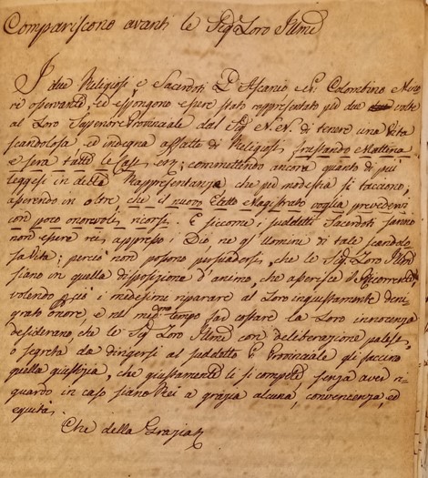 I due religiosi e sacerdoti Padre Ascanio e Padre Colombino,Minori Osservanti,ed espongono essere stato rappresentato per due volte al loro Superiore Provinciale dal Sig N.N. di tenere una vita scandalosa et indegna affatto di religiosi forestando mattina e sera tutte le case ;commettendo ancora quanto di più leggesi in detta rappresentanza che per modestia si tacciono;asserendo in oltre che il nuovo eletto Magistrato voglia prevedervi con poco onorevoli ricorsi.E siccome i suddetti Sacerdoti sanno non esser rei appresso Dio ne gl’Uomini di tale scandalosa vita ; perciò non possono persuadersi che le Sig Loro Ill.me siano in quelle disposizione d’animo che asserisce il Ricorrente volendo perciò i medesimi riparare al loro ingiustamente denigrato onore e nel medesimo tempo far contare la loro innocenza desiderano che le Sig Loro Ill.me con deliberazione palese o segreta da dirigersi al suddetto Padre Provinciale gli faccino quella giustizia che giustamente li si compete senza avere riguardo in caso sieno rei a grazia alcuna,convenienza ed equità