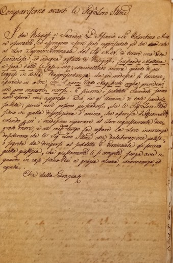La carta di archivio della supplica alla magistratura comunitativa del sacerdote confessore Gio, Santi Cantini con la quale chiede “onesta gratificazione”: integralmente trascritta è questa :