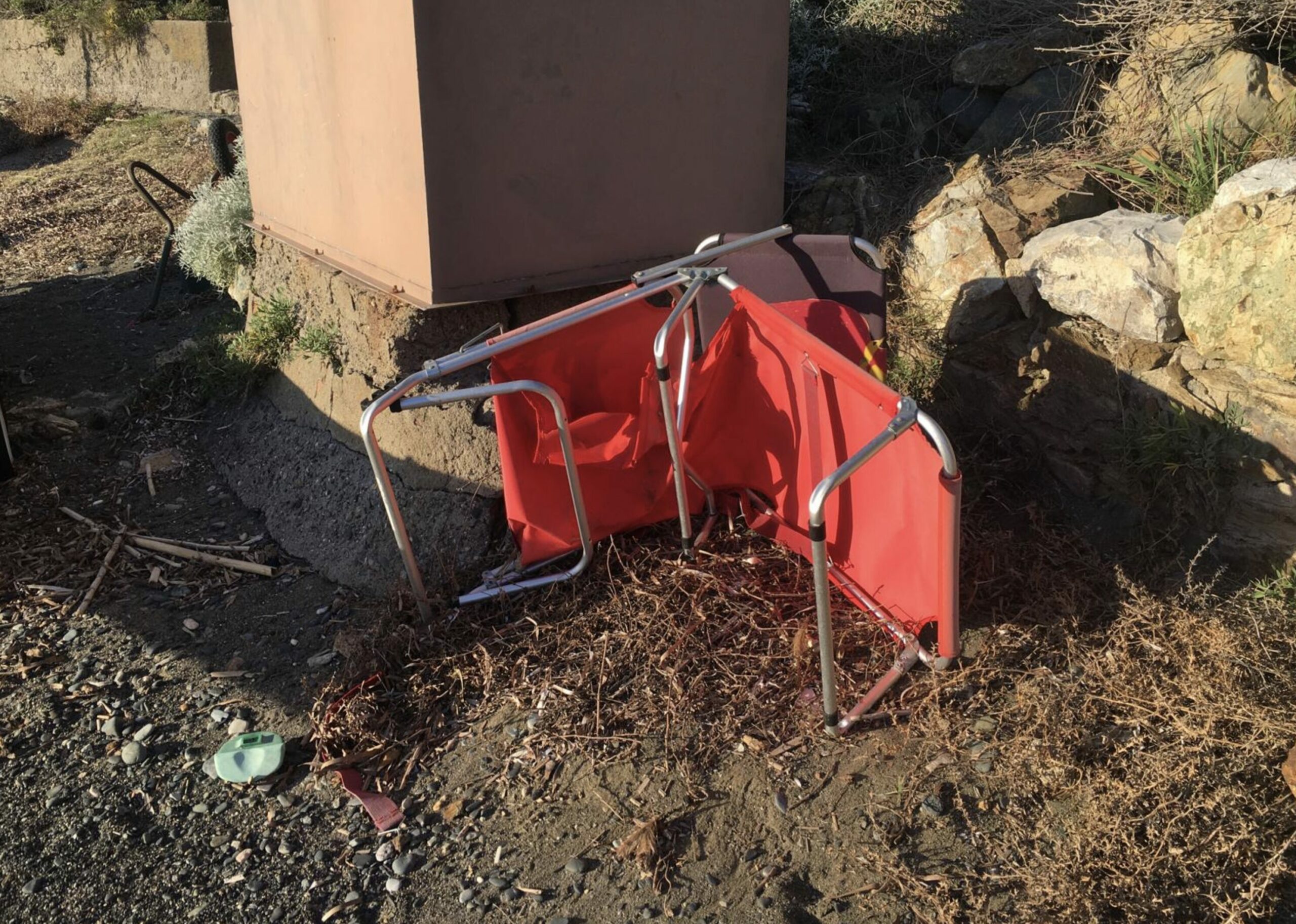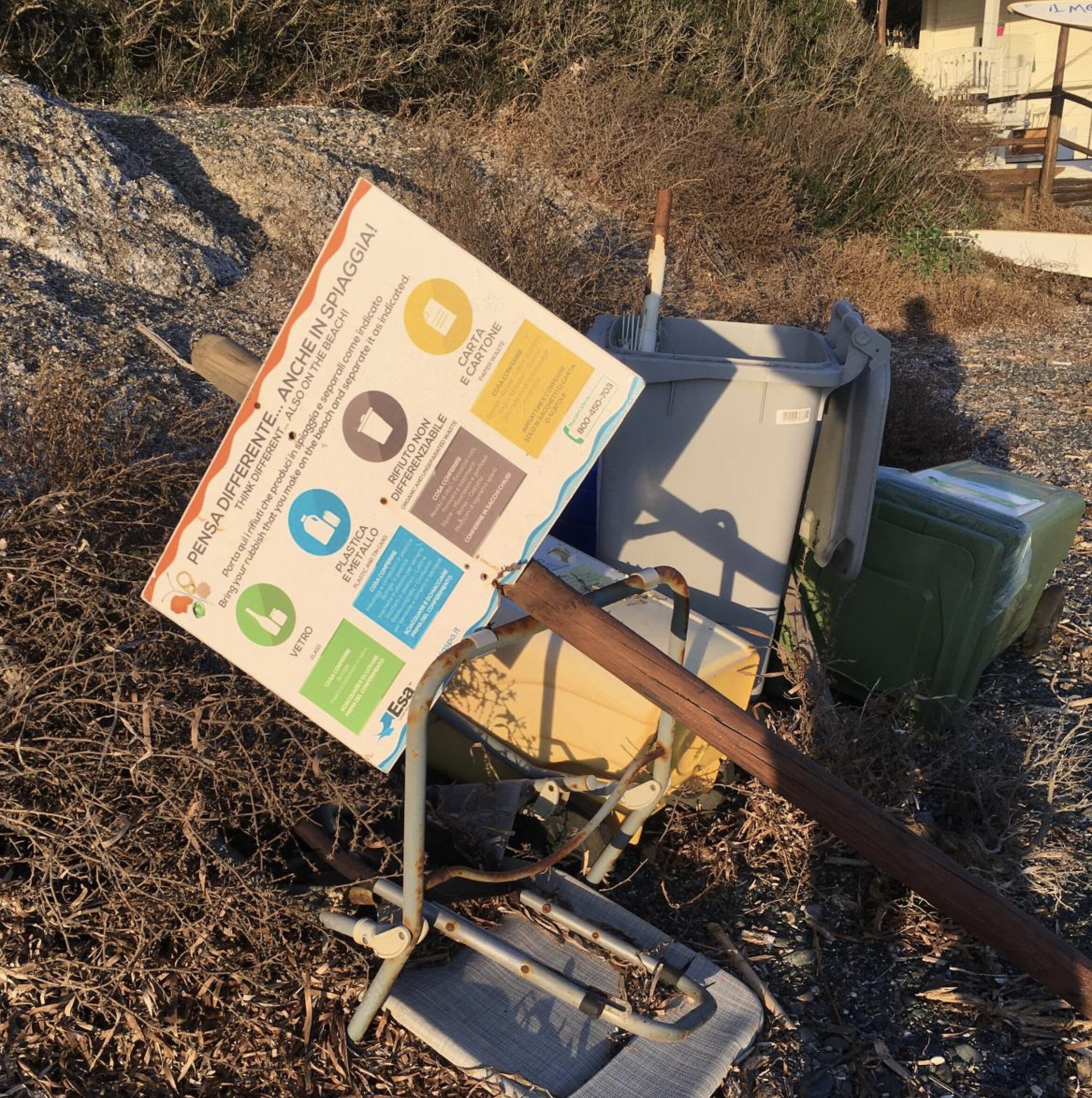 Vecchie attrezzature e rifiuti occupano e danneggiano la vegetazione costiera, il degrado sparge plastiche e microplastiche ovunque.