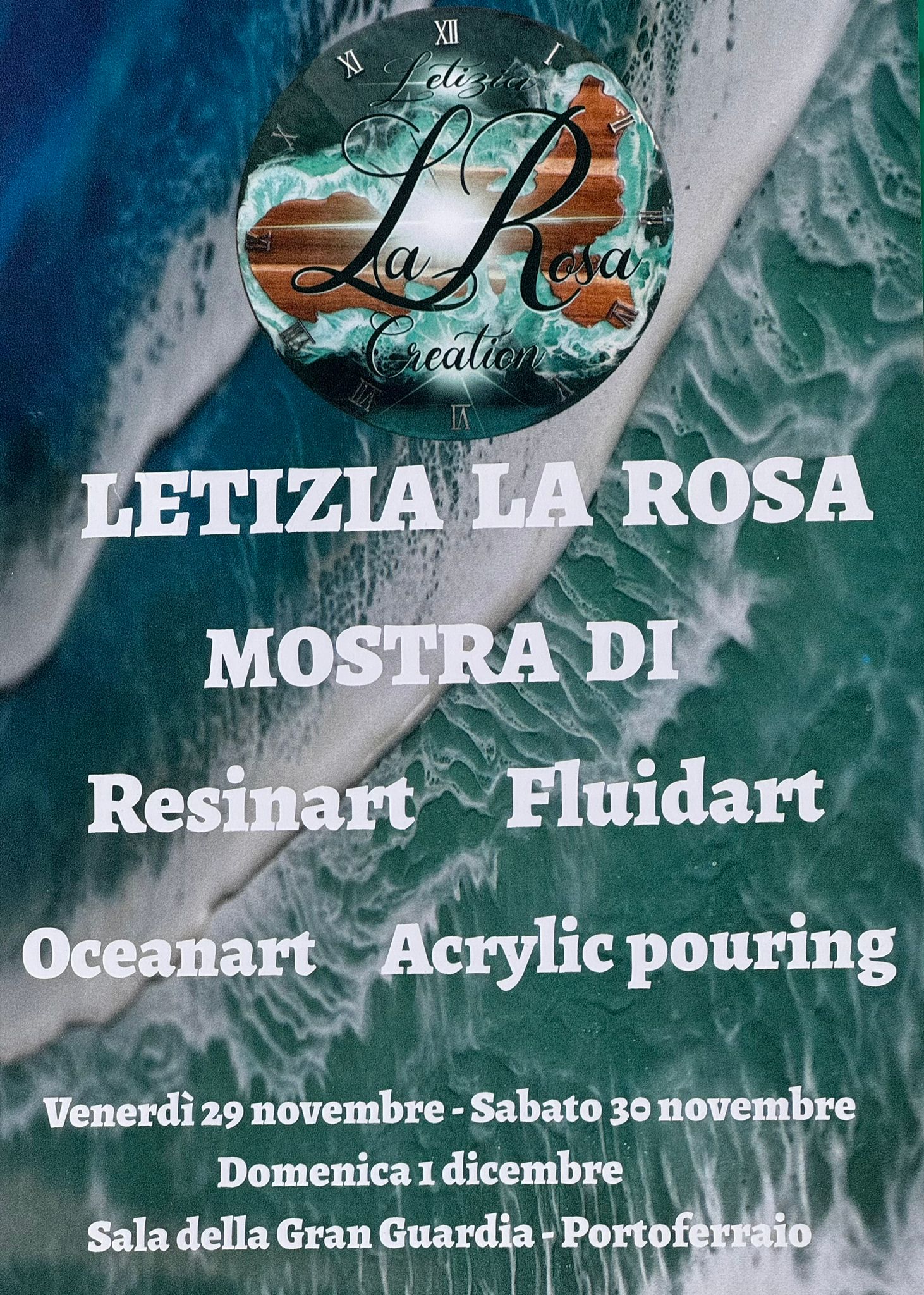 Letizia La Rosa Creation, presenta la mostra di Resinart, Fluidart, Oceanart, Acryling pouring. L’esposizione si terrà alla sala della Gran Guardia a Portoferraio da venerdi 29 novembre a domenica 1 dicembre. Questi gli orari d’apertura. Venerdi dalle 17.00 alle 19.00 Sabato e Domenica dalle 10.00 alle 13.00 e dalle 15.00 alle 19.30.