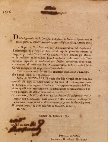 Dalla Segreteria del R. Consiglio di Stato e di Firenze è pervenuto in questo giorno al Soprassindaco il seguente Biglietto de’24 ottobre 1789