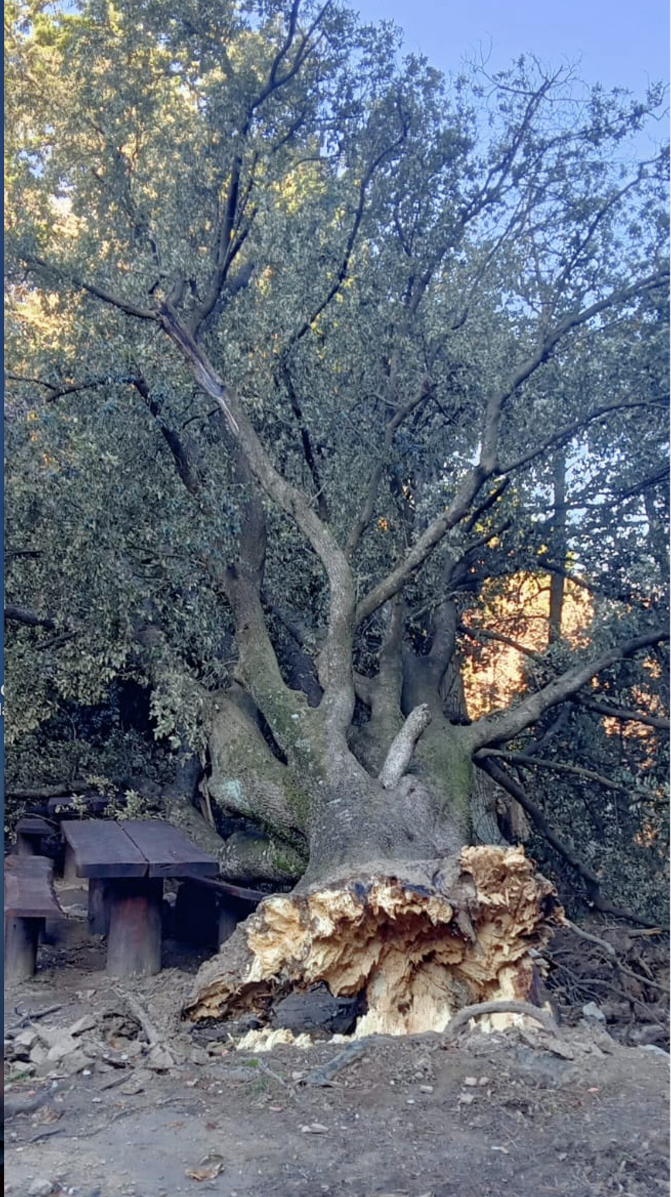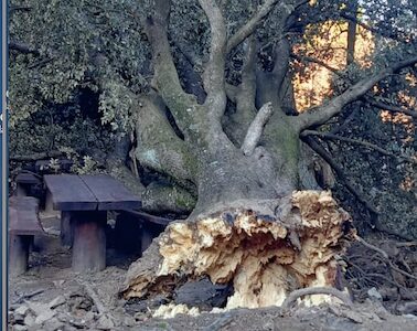 Il grande leccio di San Cerbone si è abbattuto. Forse a causa del forte vento di questi giorni che ne ha causato la caduta. L’albero, ha sfiorato la chiesetta vicina senza causare danni