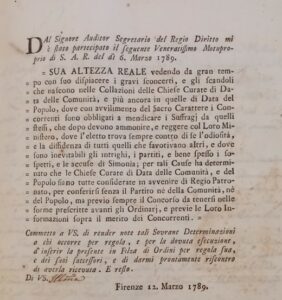 =SUA ALTEZZA REALE vedendo da gran tempo con suo dispiacere i gravi sconcerti e gli scandali che nascono nella Collazioni delle Chiese Curate di data delle Comunità e più ancora in quelle di Data del Popolo,dove con avvilimento del Sacro Carattere i Concorrenti sono obbligati e mendicare i suffragi da quegli stessi ,che dopo devono ammonire e reggere col Loro Ministero ,dove l’eletto trova sempre contro di sé l’odiosità e la diffidenza di tutti quelli che favorivano altri e dove sono inevitabili gli intrighi ,i partiti, e ben spesso i sospetti e le accuse di Simonìa ;per tali cause ha determinato che le Chiese Curate di data delle Comunità e del Popolo siano tutte considerate in avvenire di Regio Patronato ,per conferirsi senza il Prtito né della Comunità ,né del Popolo ,ma previo sempre il concorso da tenersi nelle forme avanti gli Ordinarj e previo le loro informazioni sopra il merito dei Concorrenti =