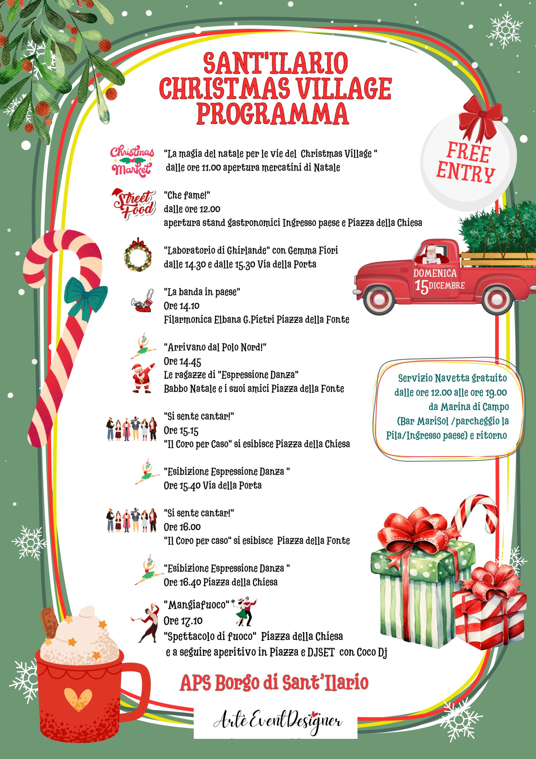 navetta gratuito da Marina di Campo (Bar MariSol/ parcheggio La Pila /ingresso del paese di Sant’Ilario) dalle 12.00 alle 19.00. Un sentito grazie va a “Nocentini Group”, “Pompe Funebri Posini”, “Elba System” e “MVD”, ma soprattutto a tutti gli artisti, i tecnici, i volontari e i membri della comunità di Sant’Ilario, il cui supporto e entusiasmo sono stati fondamentali per la realizzazione di questo straordinario evento. “Non mancate! Unitevi a noi al Sant’Ilario Christmas Village 2024 per celebrare insieme la magia del Natale. Vi aspettiamo!