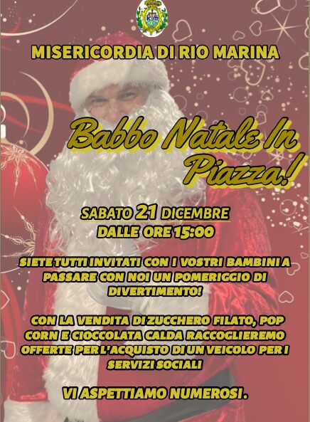 Sabato 21 dicembre alle ore 15.00 la Misericordia di Rio Marina organizza il “Babbo Natale in Piazza”. Un pomeriggio di divertimento con la vendita di zucchero filato, Pop corn e cioccolata calda. Durante il pomeriggio di festa, verranno raccolte offerte per l’acquisto di un veicolo per i servizi sociali.