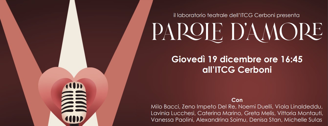 Giovedì 19 dicembre, alle ore 16:45, l’atrio dell’ITCG Cerboni ospiterà “Parole d’Amore”, una breve performance teatrale realizzata dagli alunni e dalle alunne del laboratorio teatrale della scuola.