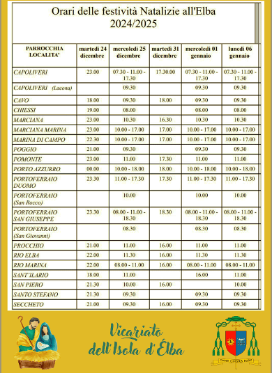 “Il giorno di Natale- prosegue il parroco – le messe in tutte le chiese di Portoferraio seguiranno l’orario domenicale. La messa solenne sarà quella delle 11 in Duomo. E per quest’anno nel giorno di Natale, i tre sacerdoti della nostra Comunità pastorale invitano coloro che trascorreranno il pranzo di Natale da soli a condividere con loro questo momento, presso il Salone San Giuseppe. A questo proposito vi preghiamo gentilmente di far sapere entro martedì 24 dicembre, i nomi ed i recapiti di tutti coloro che potremo rendere felici, attraverso questo piccolo gesto, così agiremo per dare le necessarie disposizioni per preparare al fine della loro partecipazione. Giovedì 26 sarà la festa di Santo Stefano, patrono della più piccola delle parrocchie della nostra comunità e realizzeremo in quella sede l’unica messa in tutta Portoferraio, quindi invitiamo tutti a intervenire a Santo Stefano alle Trane alle 11. Quest’anno questa Messa sarà anche una preghiera speciale per i nostri detenuti in occasione dell’apertura, nello stesso giorno, della Porta Santa del Carcere di Rebbibia da parte di Papa Francesco. Venerdì 27.12 l’Elba gioisce e ringrazia il Signore insieme al nostro Vescovo Carlo con l’inaugurazione dell’Anno Santo presso il nostro Duomo, in piazza della Repubblica a Portoferraio. Quel giorno l’unica messa, in tutta l’isola, sarà quella presieduta dal Vescovo insieme a tutto il clero elbano alle 17.30, in Duomo. Incoraggiamo tutti a fare uno sforzo in più per partecipare a questa occasione unica”. E infine, da oggi fino alla festa dell’Epifania, sarà promossa, nella chiesa di San Giuseppe, una speciale lotteria di Natale a sostegno della ristrutturazione del Salone di questa chiesa, per servire meglio le tante attività che si organizzano in questo luogo. I premi speciali di questa lotteria sono indicati nella bacheca all’ingresso della chiesa. Ringraziamo di cuore il sostegno che potrà venire da tutti quanti. Don Kevin Sciberras infine, col presente comunicato, diffonde anche l’orario di tutte le celebrazioni natalizie nelle varie chiese dell’isola e ringrazia i media locali per il sostegno sempre attuato nell’anno, sulle varie testate.